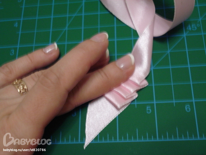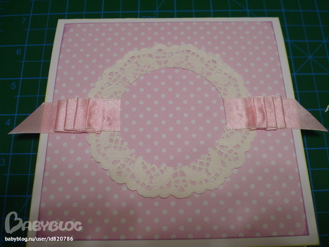 На ленте формируем складочки и фиксируем их клеем прямо на открытке: