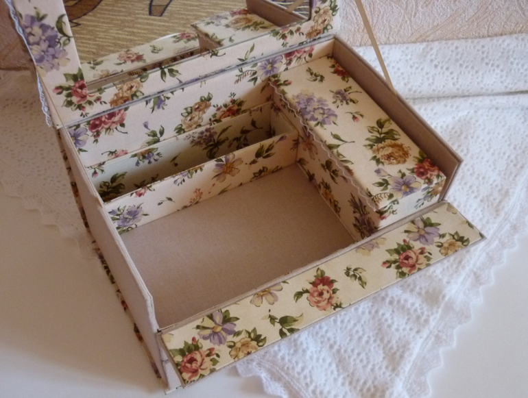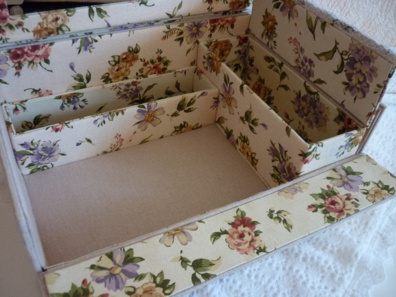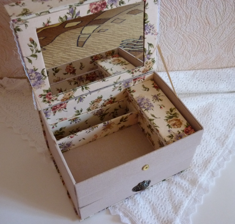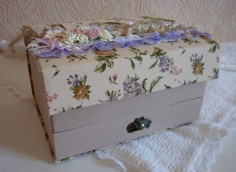 Я сегодня хочу Вам показать большую шкатулку, ну очень большую, размеры ее 30х20х20. В основе 2мм картон, все проложено тонким слоем мягкой подложки и обтянута цветочным хлопком/однотонным льном. Она двухуровневая, нижний уровень это выдвижной ящик, а верхний отделение с еще одной шкатулкой и двумя отделениям. Крышка обильно украшена кружевом, цветами, пуговичками и чипбордом в виде эйфелевой башни, на внутренней крышке я разместила зеркало.