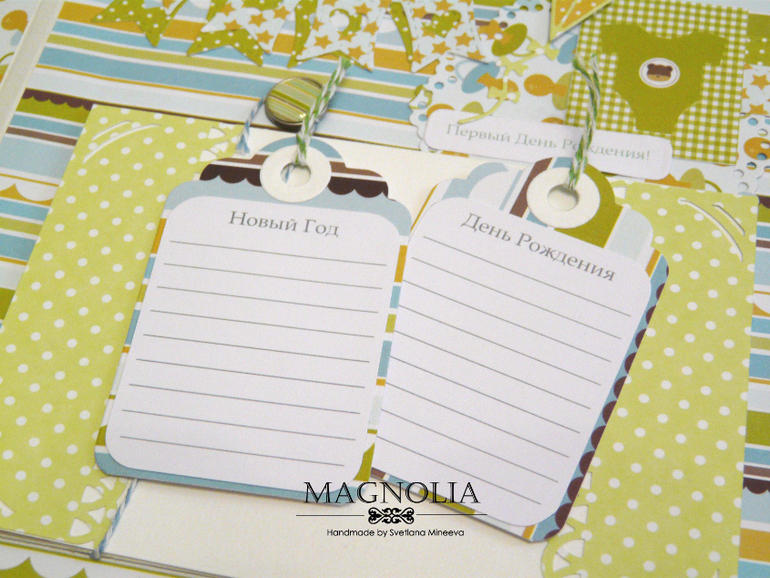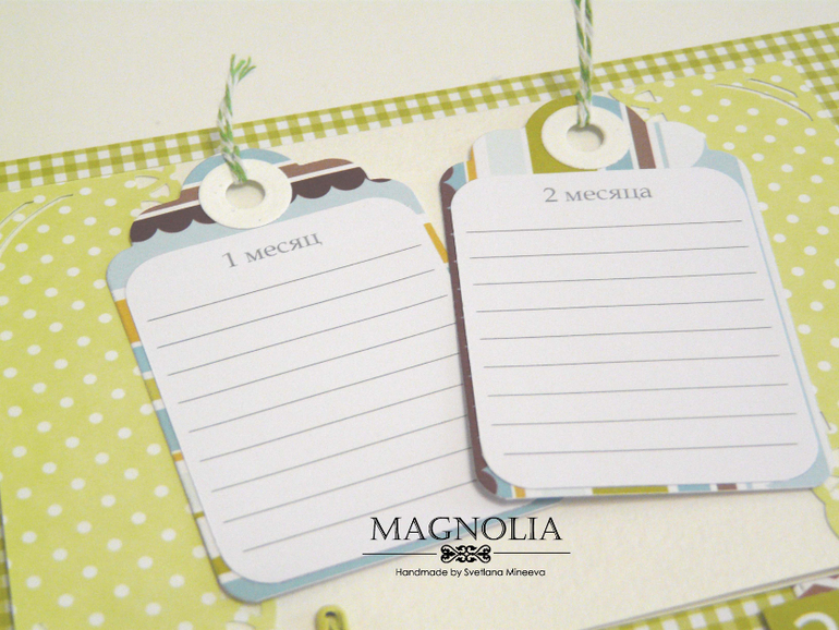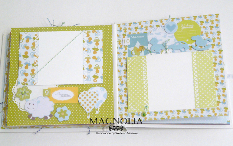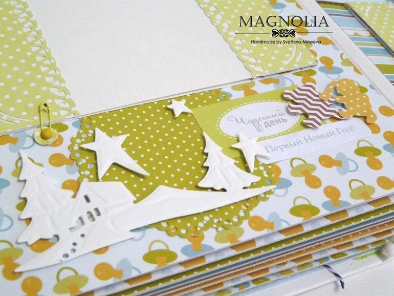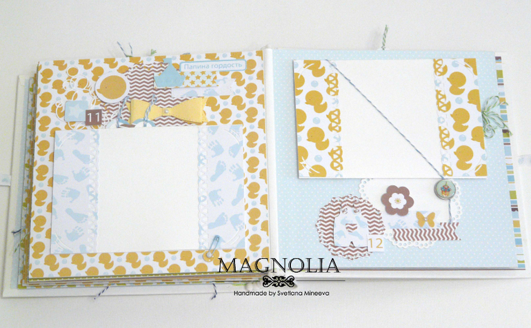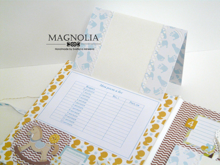 Далее фото разворотов. Сначала идет разворот для фото беременности и из роддома, потом 12 страниц для каждого месяца первого года и последний разворот посвящен новому году и дню рождению.