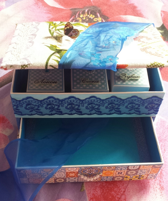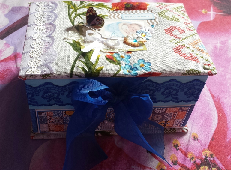 Коробки, шкатулки, комодыУх, наконец-то, смастерила!Так боялась такой работы, ткань, ящик, крышка... миллиметр туда-сюда и , косяк. Но все вышло!