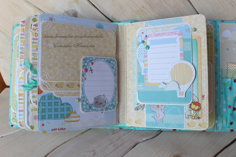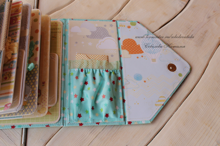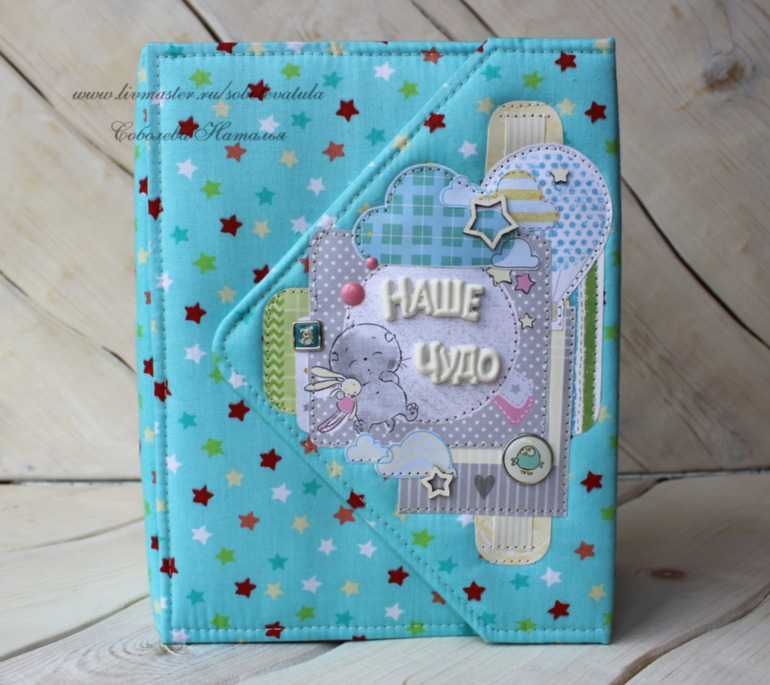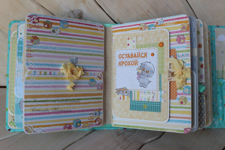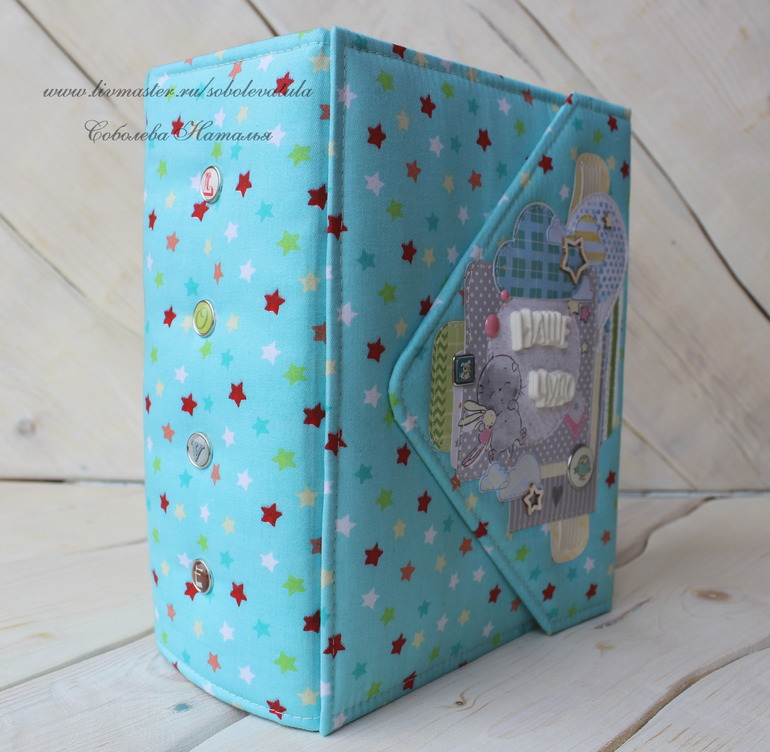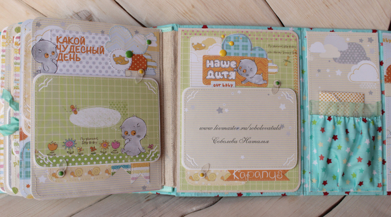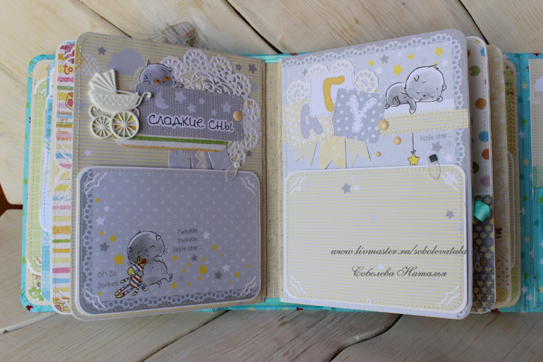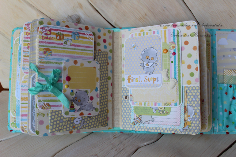Альбомы ДетскиеВсем привет! Хочу показать вам свой новый альбомчик. Размер альбома 15х21см, вмещает в себя более 50 фото размером 10х15см и 9х13см. Внутри 7 разворотов, есть конверты, тканевый кармашек, карточки для записей и метрика малыша, делала универсальным, чтобы подходил как для мальчика так и для девочки. Смотрим