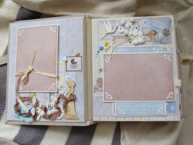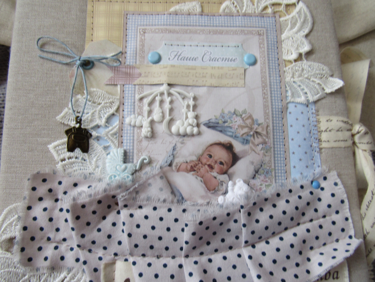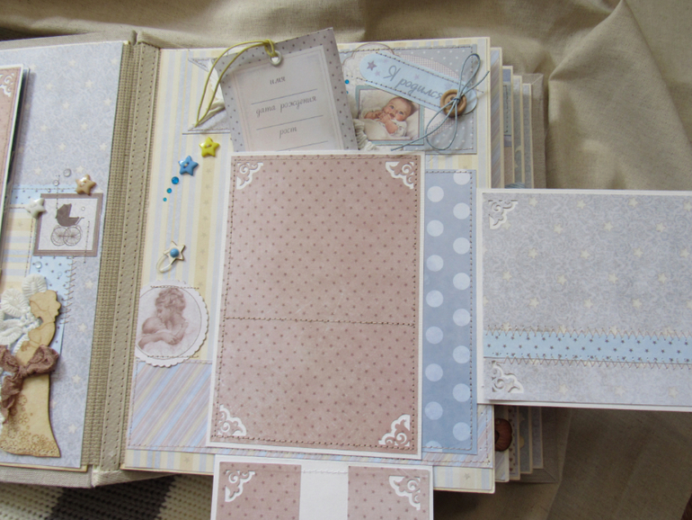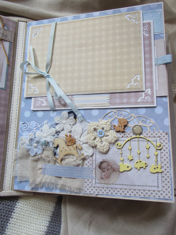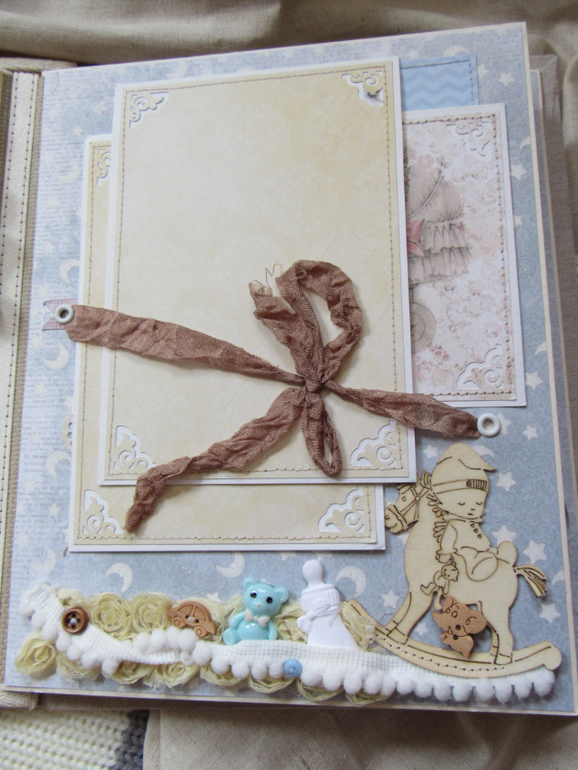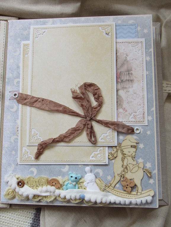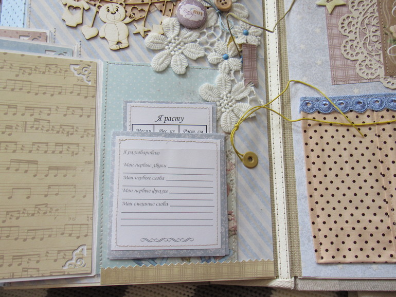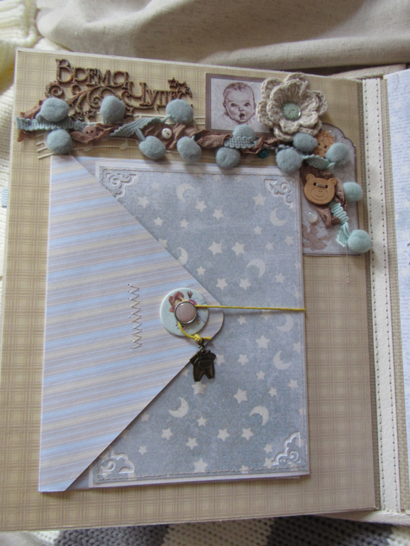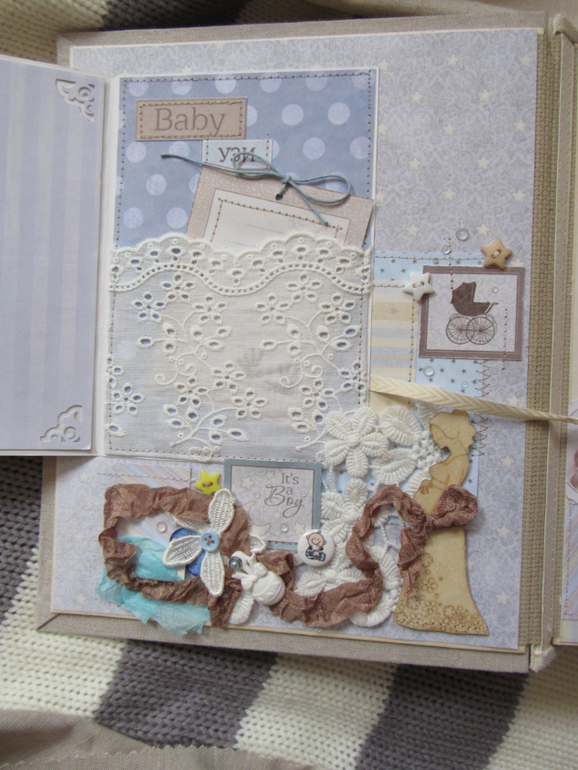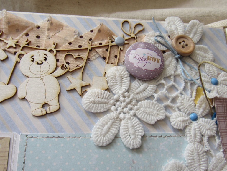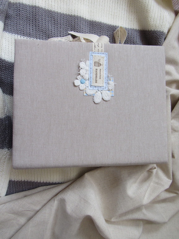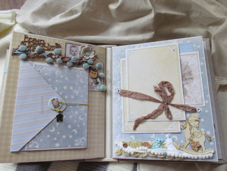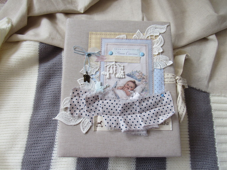 Альбом размером 20на25 на 5 разворотов (10 страниц). Прошитый переплет, обложка из натурального льна. Рассчитан на более чем 50 фото от рождения до года или более - есть секретные развороты, в конце большой карман для дополнительных фото из корейского хлопка. Также есть основные карточки для записи развития малыша. Есть хлопковый карман для снимков УЗИ и конвертик для локона)) В работе использовала много кружева, вязаностей и других украшалок)))) смотрим)