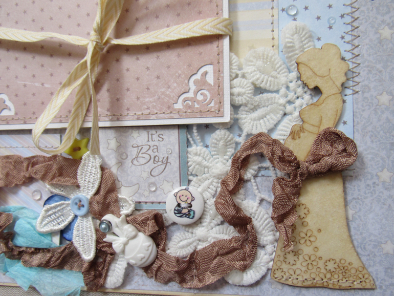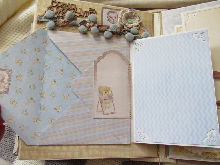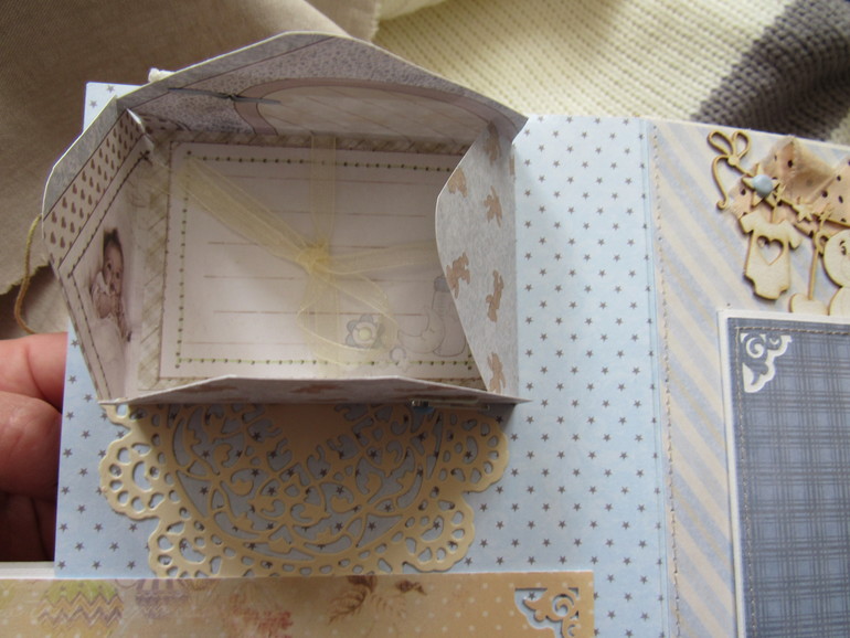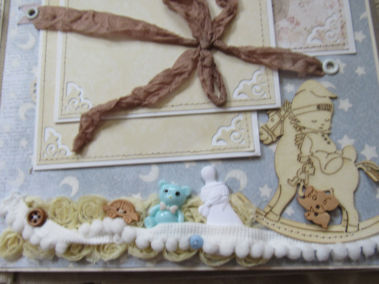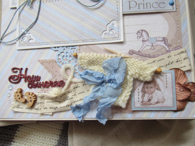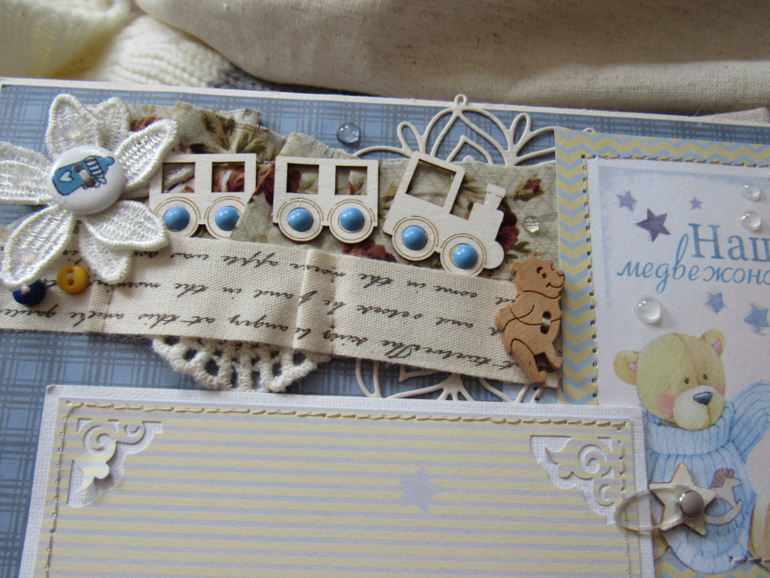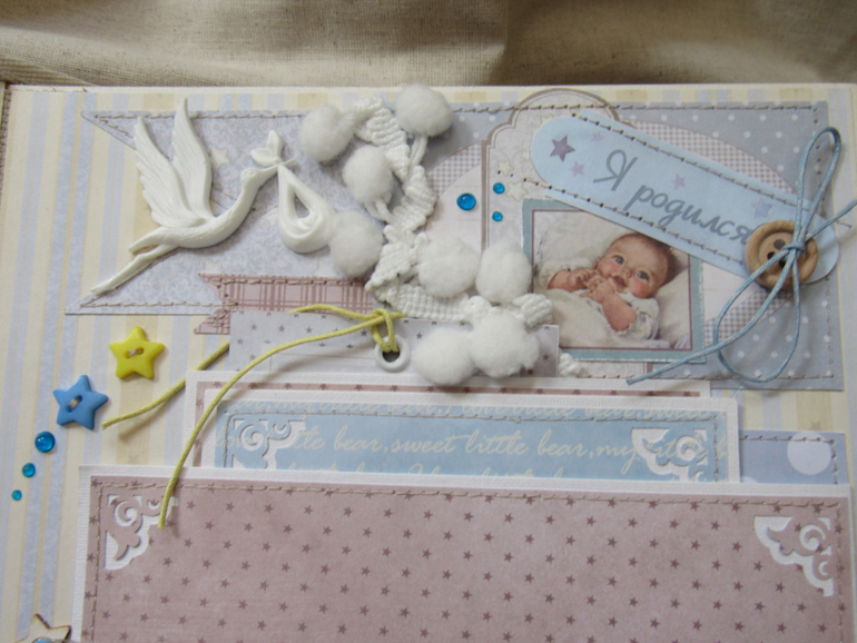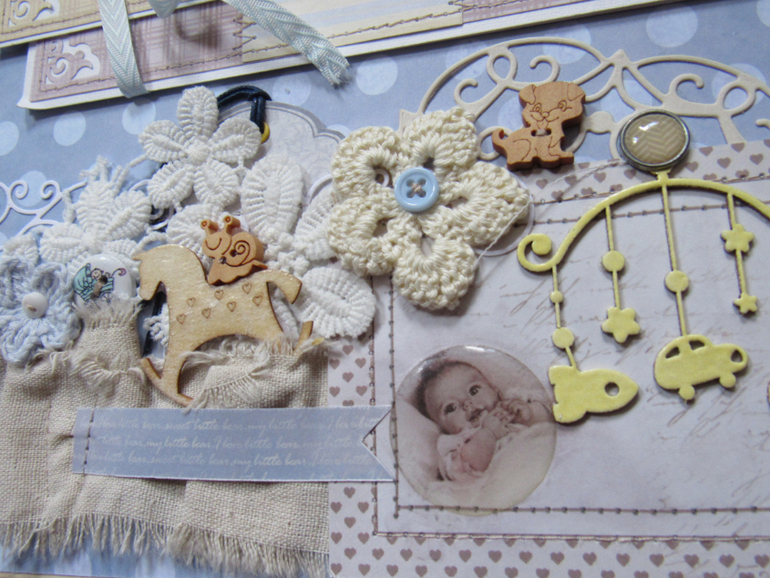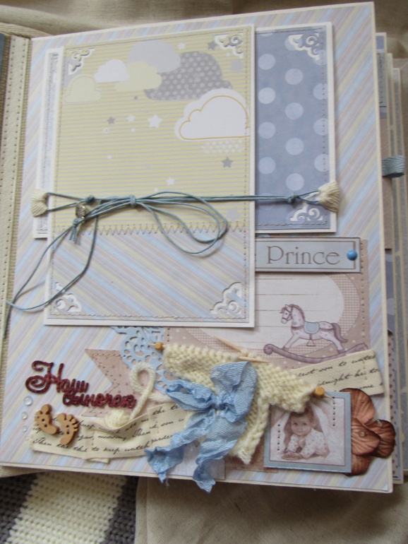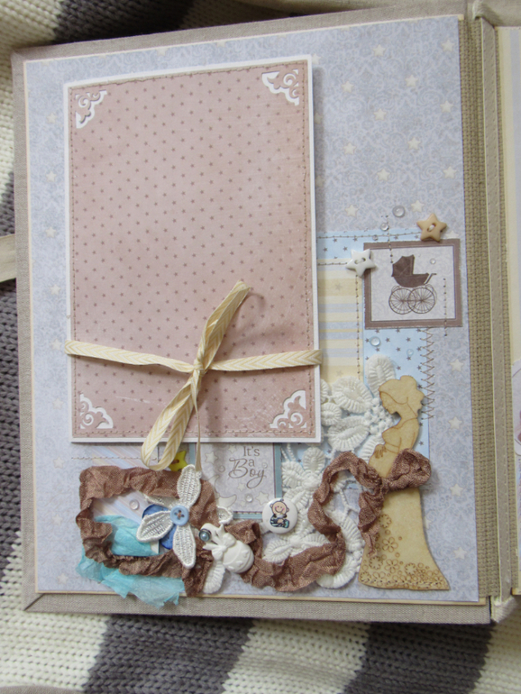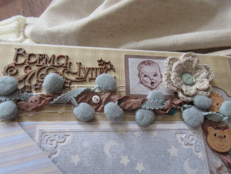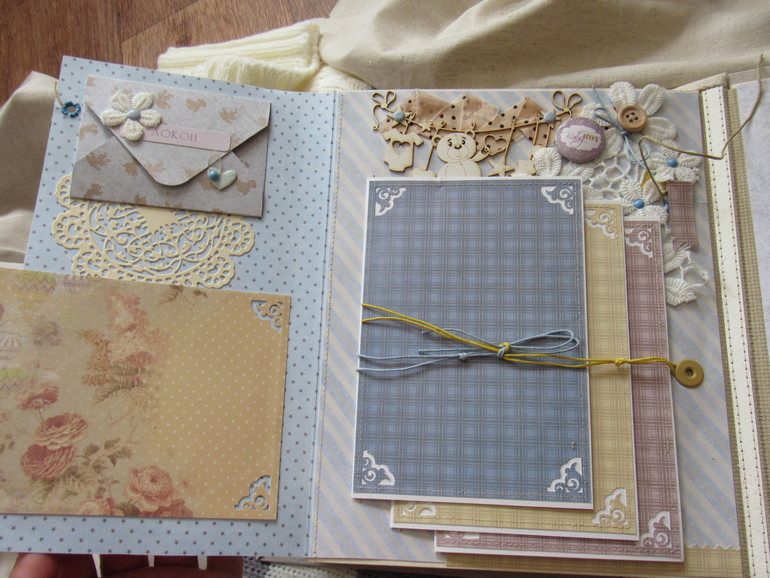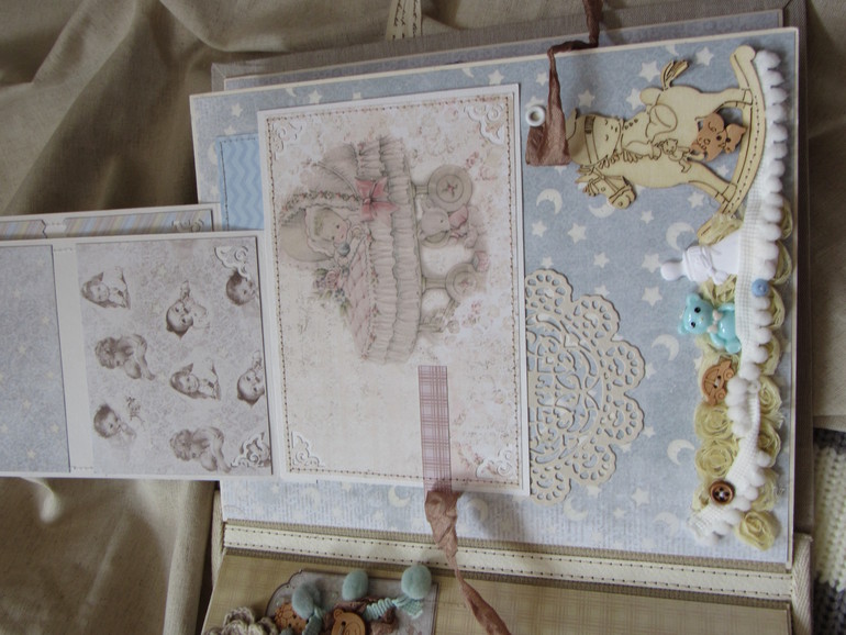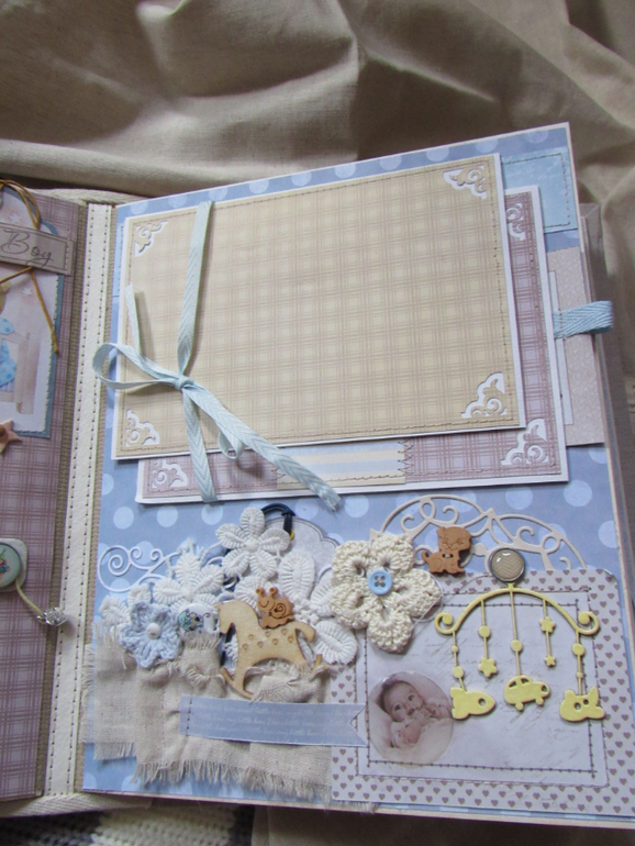 Альбом размером 20на25 на 5 разворотов (10 страниц). Прошитый переплет, обложка из натурального льна. Рассчитан на более чем 50 фото от рождения до года или более - есть секретные развороты, в конце большой карман для дополнительных фото из корейского хлопка. Также есть основные карточки для записи развития малыша. Есть хлопковый карман для снимков УЗИ и конвертик для локона)) В работе использовала много кружева, вязаностей и других украшалок)))) смотрим)