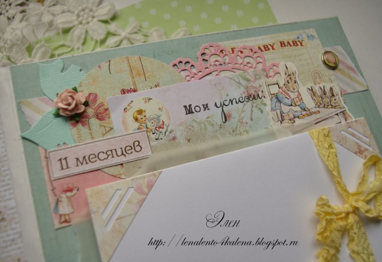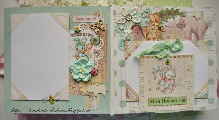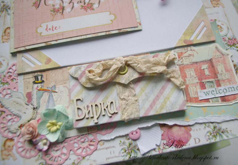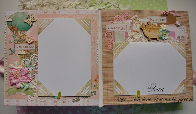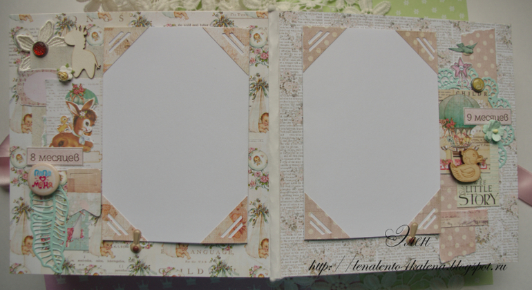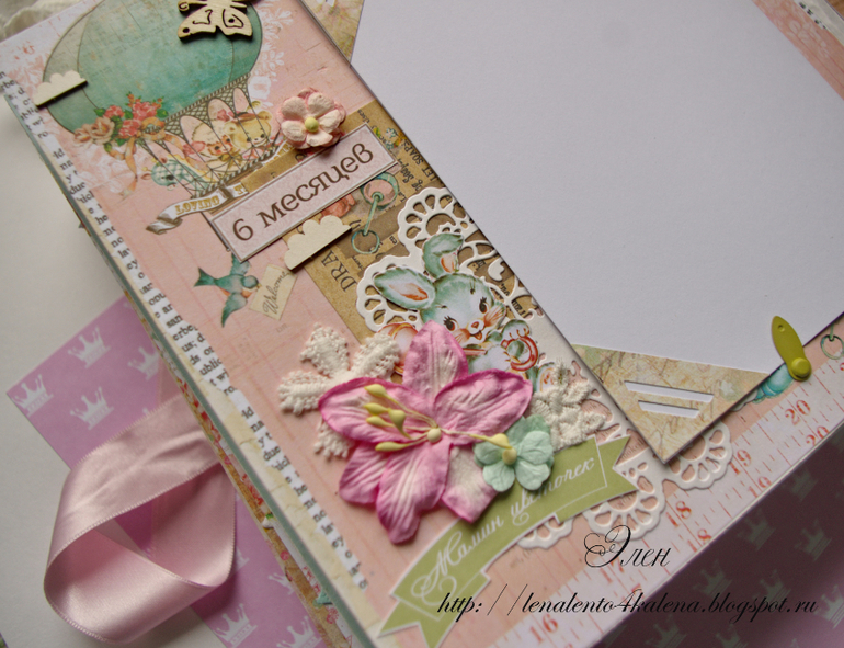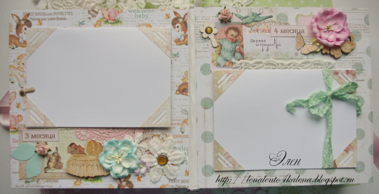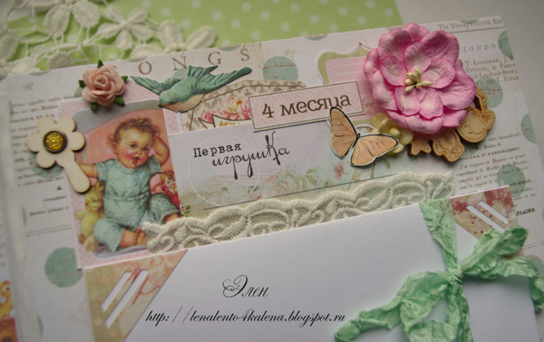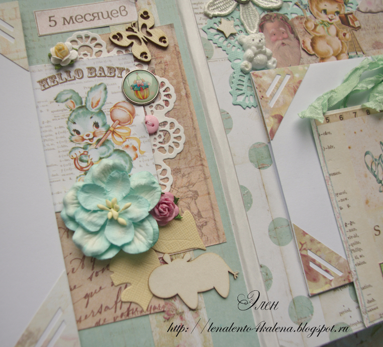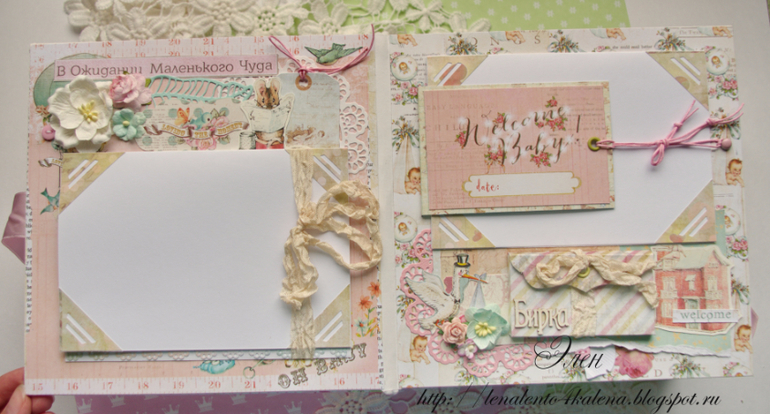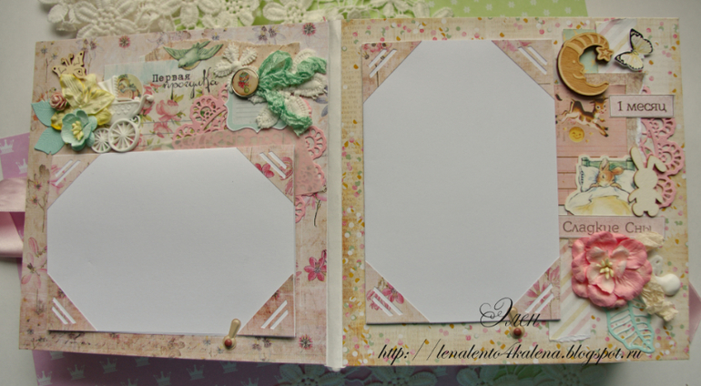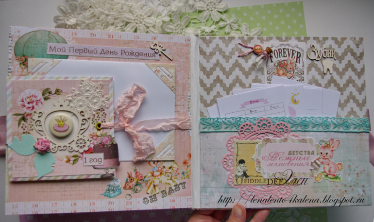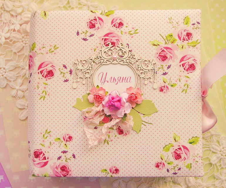 Альбом украшен цветами, воздушными шебби лентами, фишками, ажурной вырубкой,чипбордом. Есть кармашки для снимка УЗИ, бирочки из роддома, локона с первой стрижки, первого зубика.