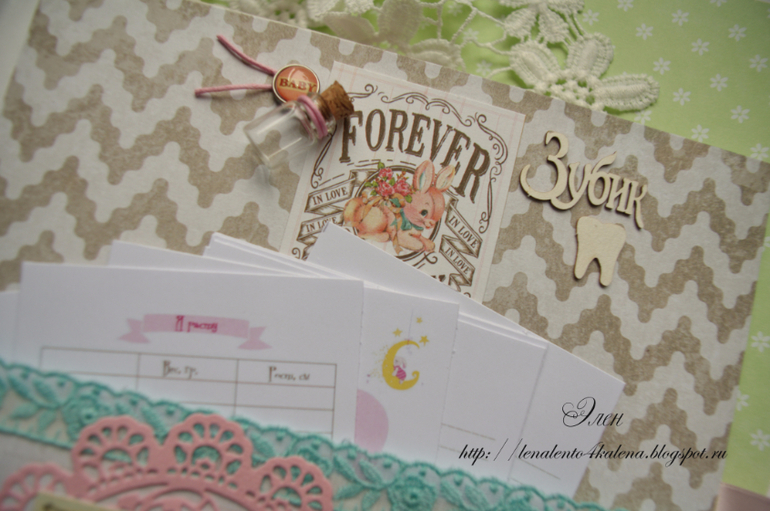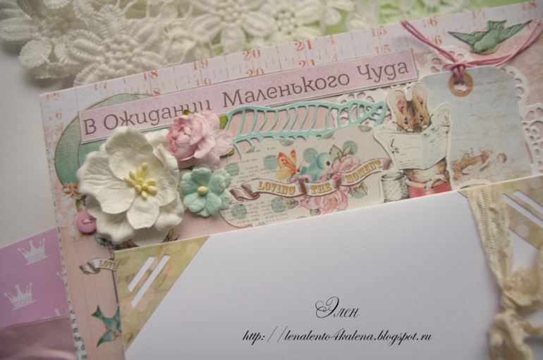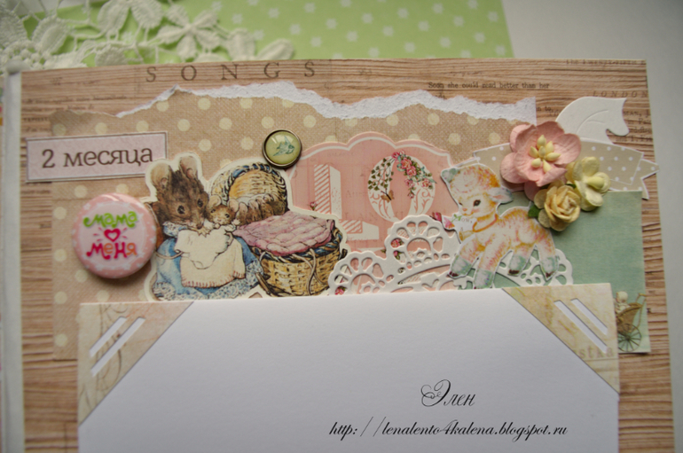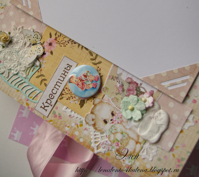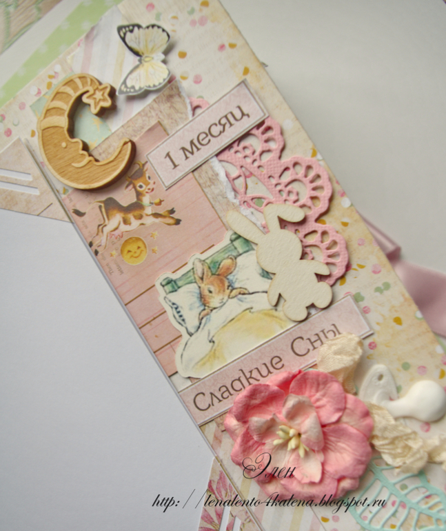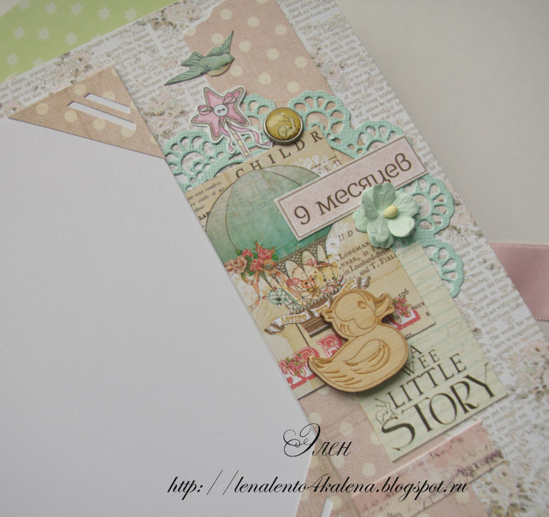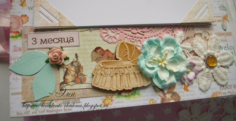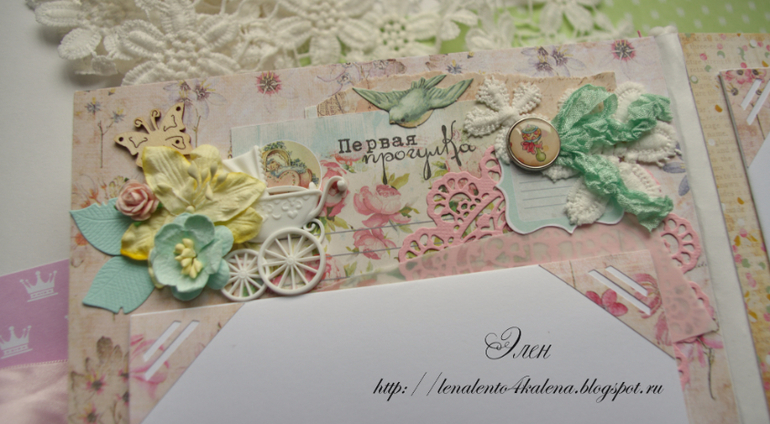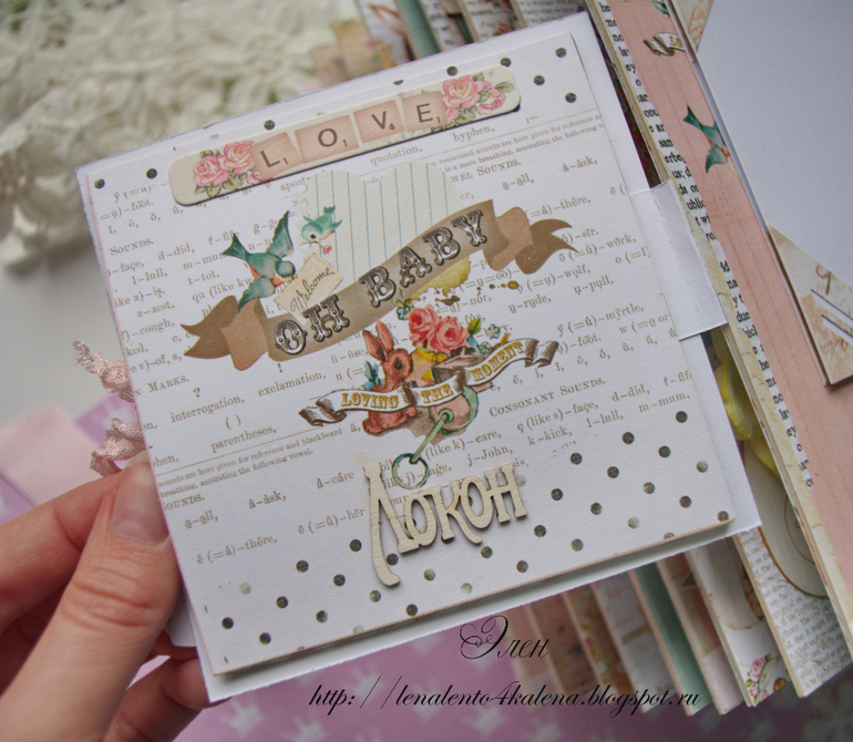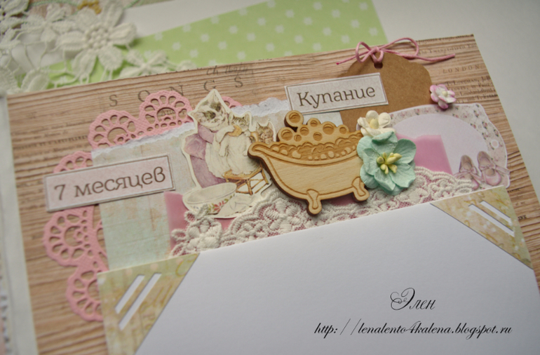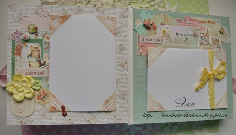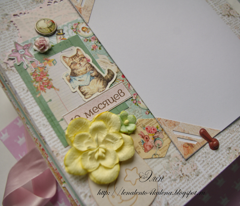 Альбом украшен цветами, воздушными шебби лентами, фишками, ажурной вырубкой,чипбордом. Есть кармашки для снимка УЗИ, бирочки из роддома, локона с первой стрижки, первого зубика.