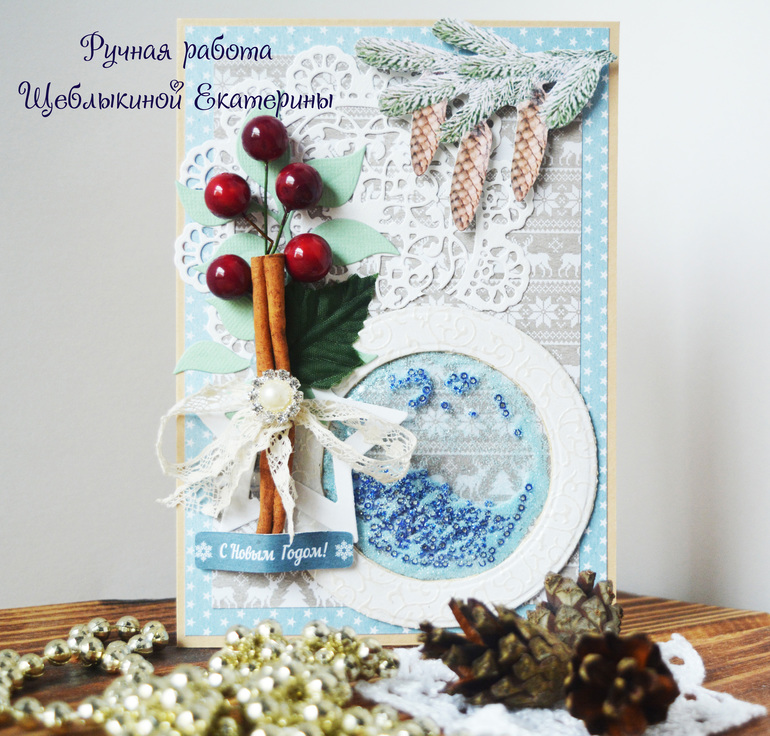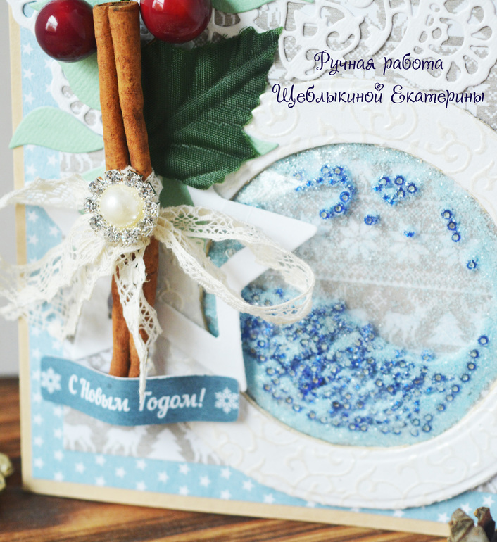 Особый шарм придала веточка корицы, которая как нельзя кстати вписалась в новогоднюю тематику открытки!