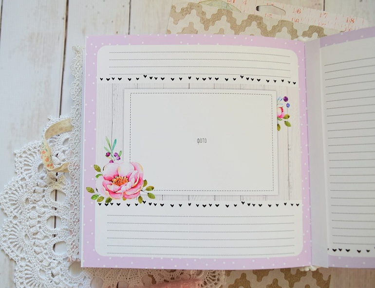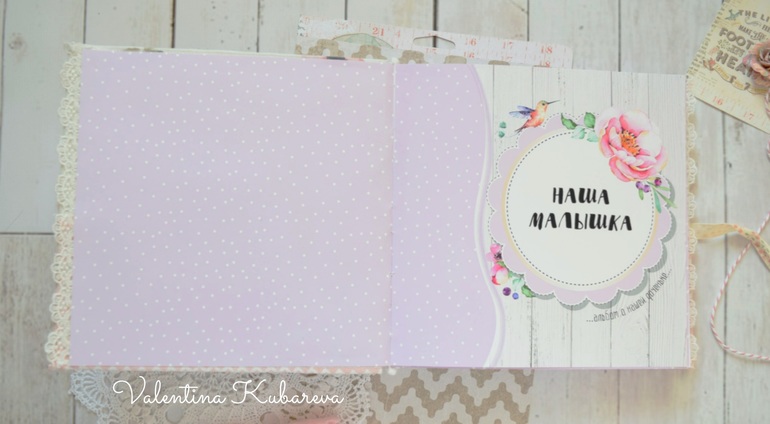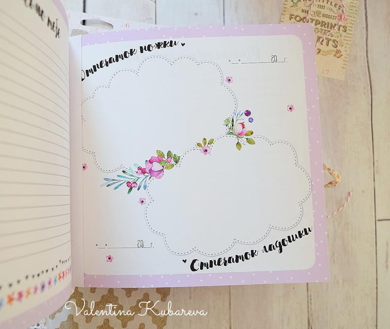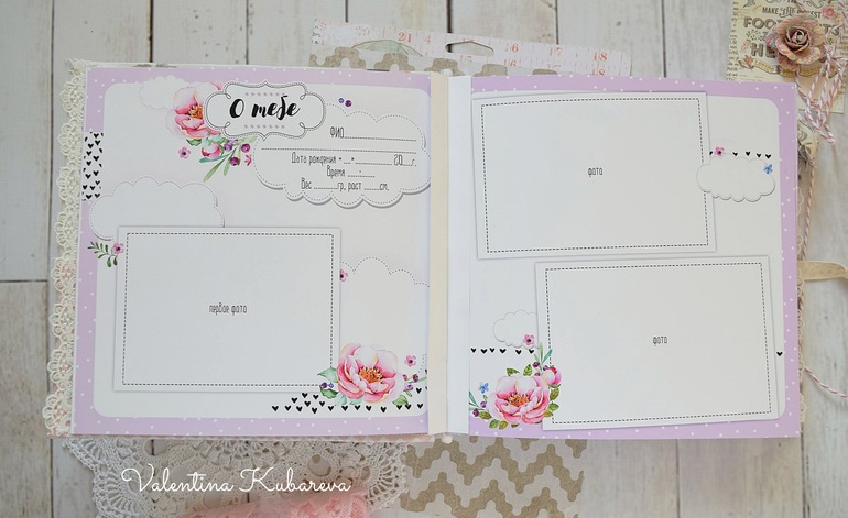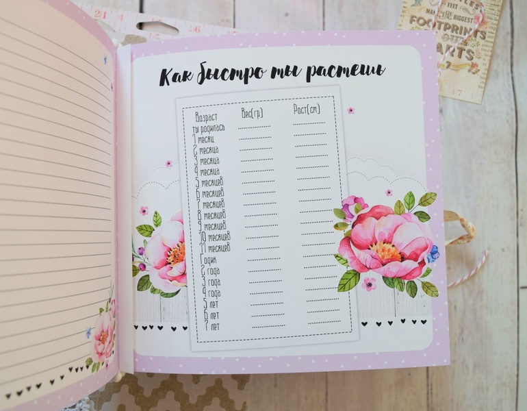 Внутри странички для записей о рождении, развитии, достижениях малышки. Множество мест для фото. ( по месяцам и далее по годам до 7 лет) . Линовка для записей.