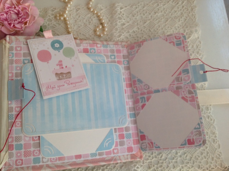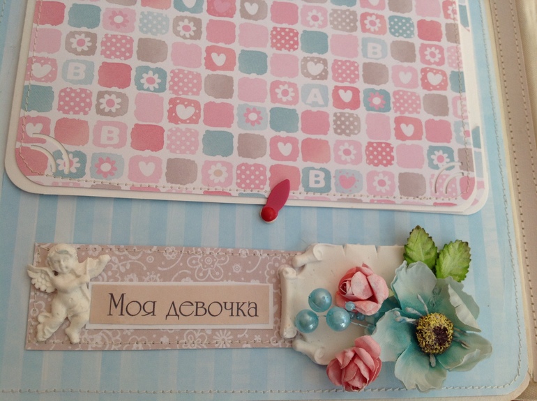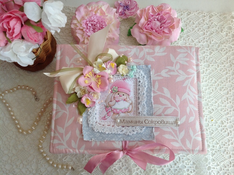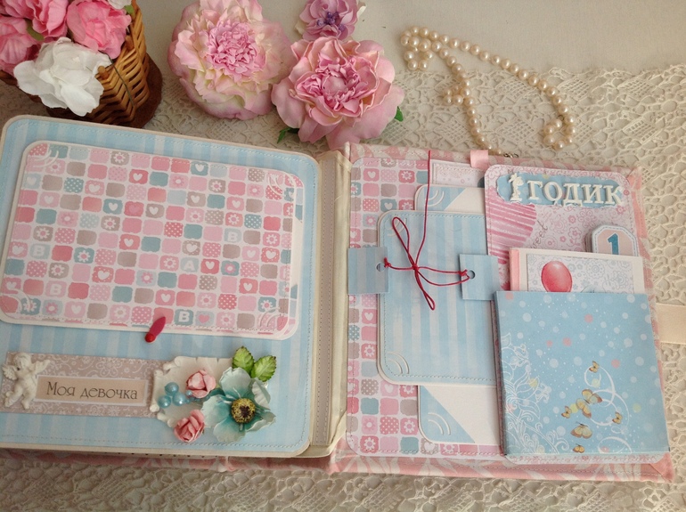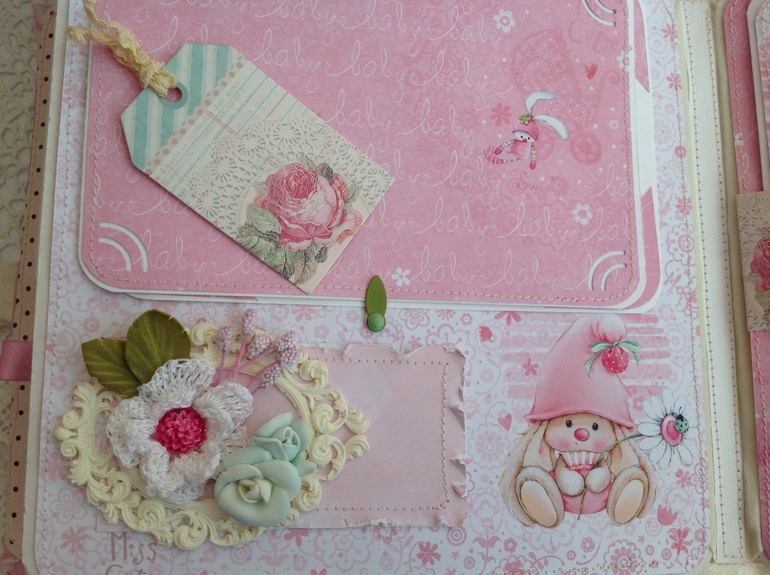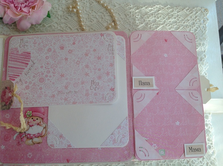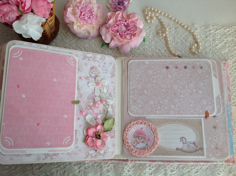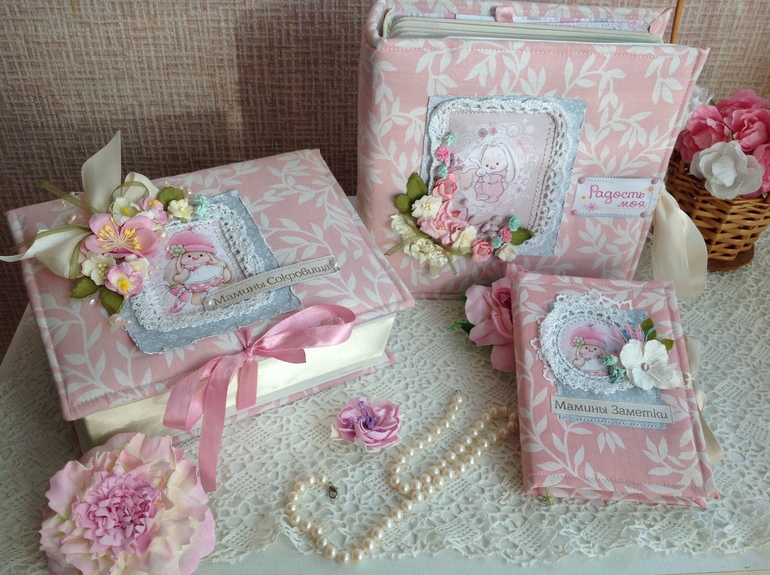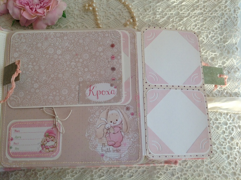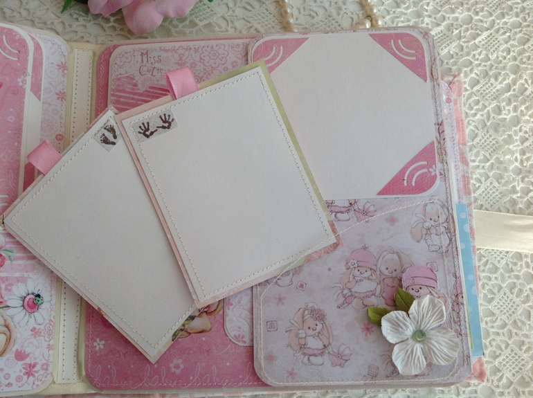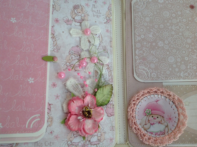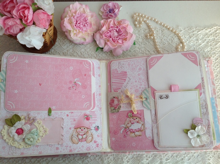 Вот и я решила поработать с зайками Ми. Получился комплект из маминых сокровищ, блокнота для записей и альбома. Альбом не большой - 20 * 20, но вмещает в себя 80 фото. Из них 69 10*15 и 11 меньшего формата. Есть теги для записей, для отпечатков ручки и ножки, а так же книжечка для записей о развитии малышки по месяцам. Смотрим?