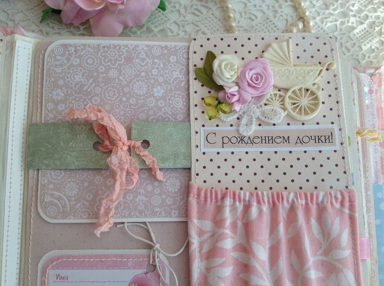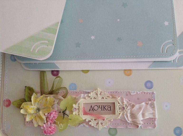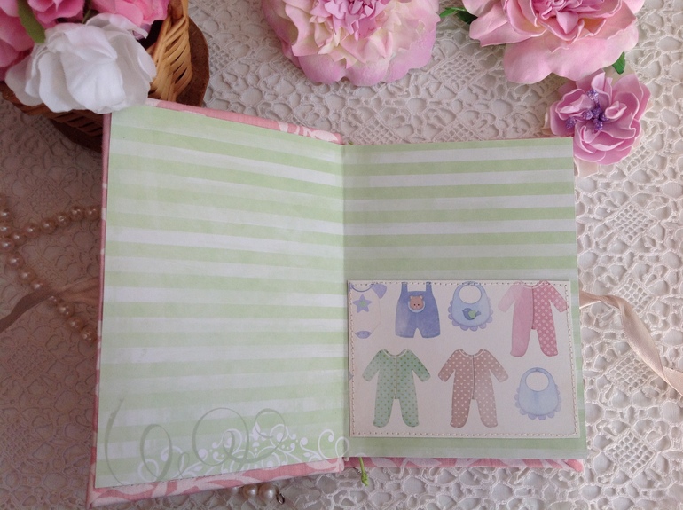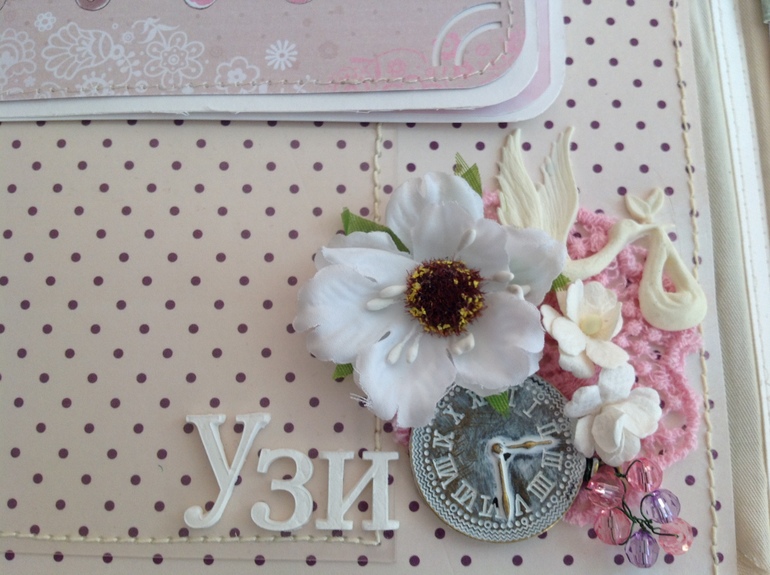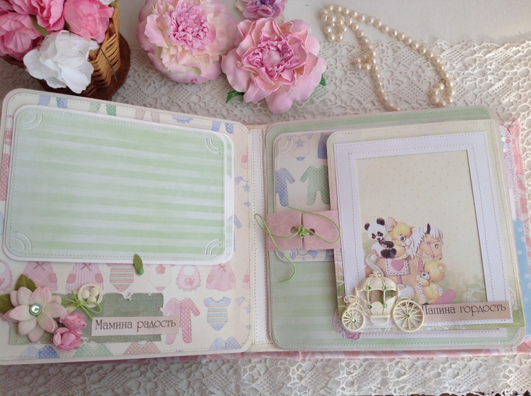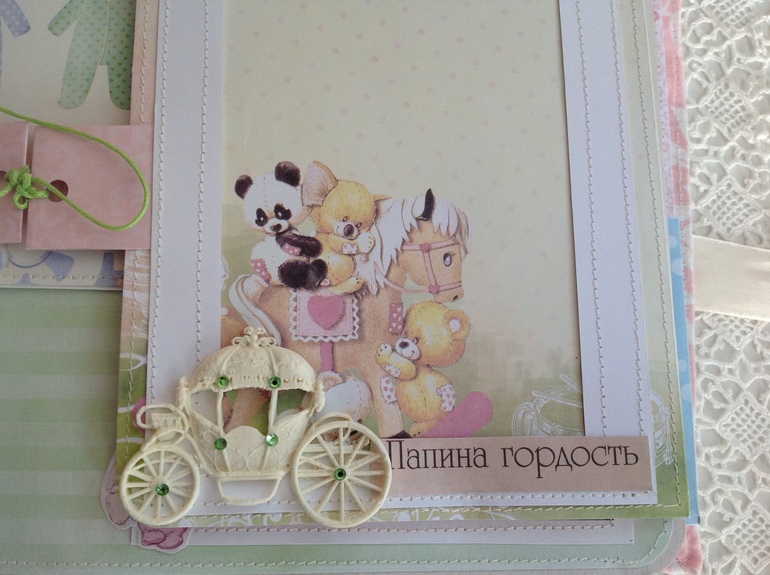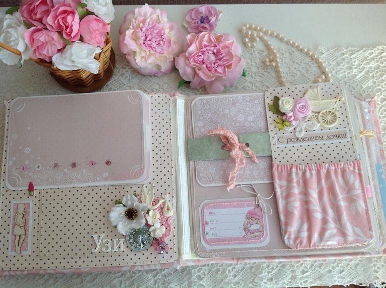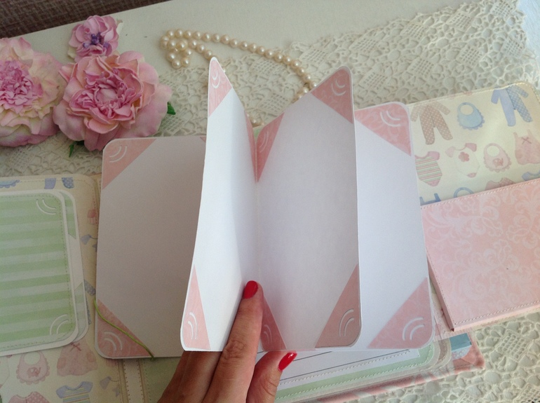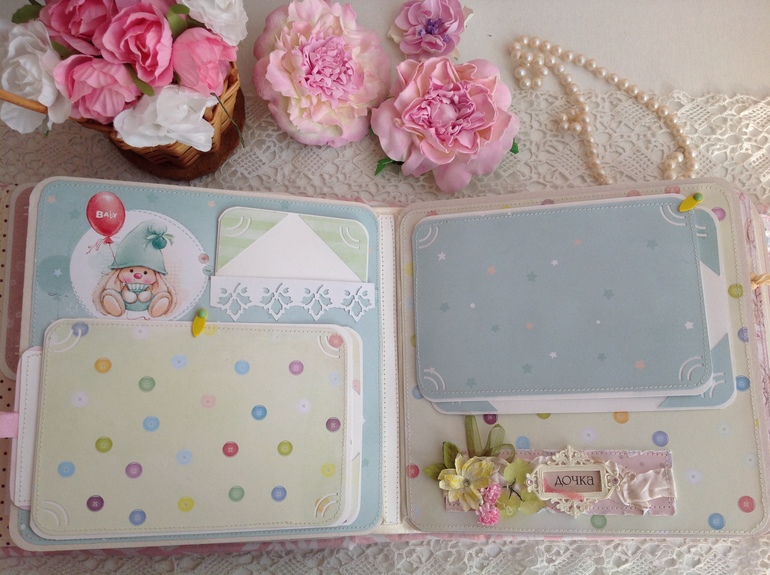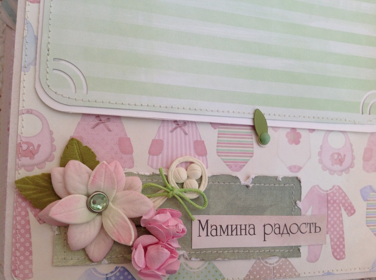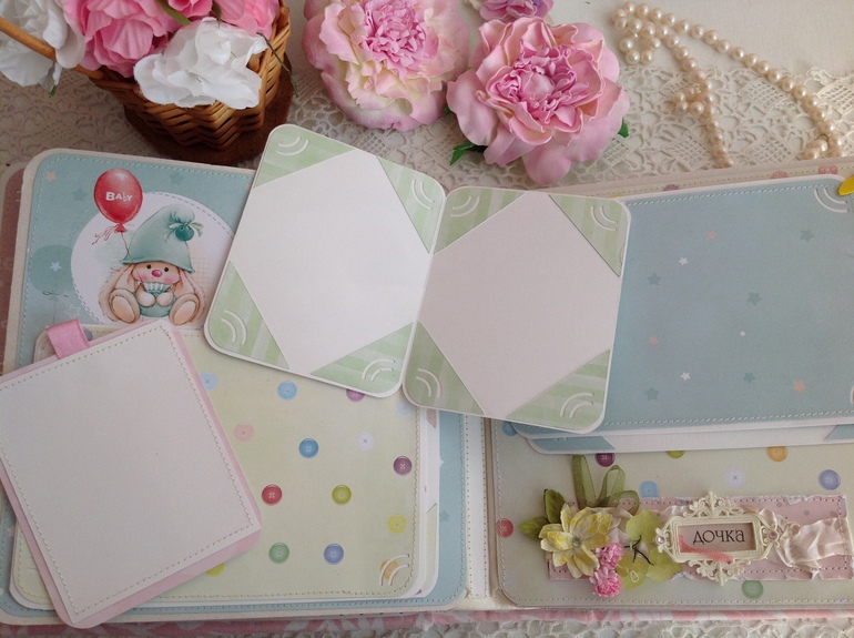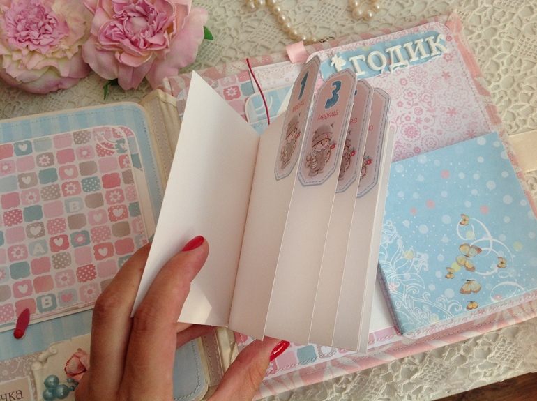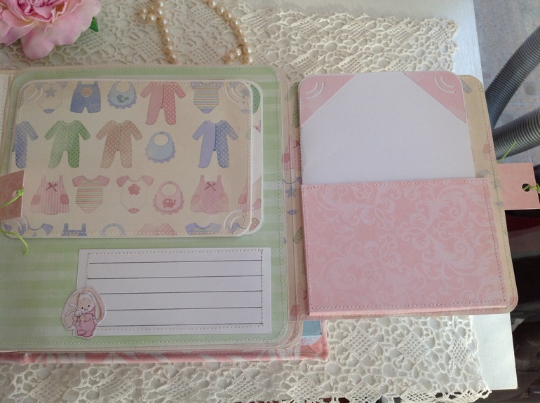 Вот и я решила поработать с зайками Ми. Получился комплект из маминых сокровищ, блокнота для записей и альбома. Альбом не большой - 20 * 20, но вмещает в себя 80 фото. Из них 69 10*15 и 11 меньшего формата. Есть теги для записей, для отпечатков ручки и ножки, а так же книжечка для записей о развитии малышки по месяцам. Смотрим?