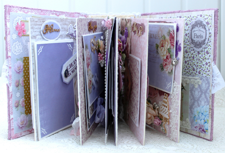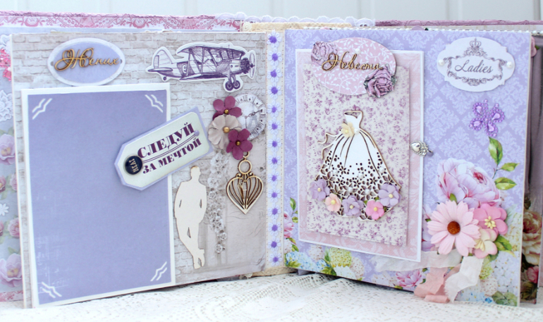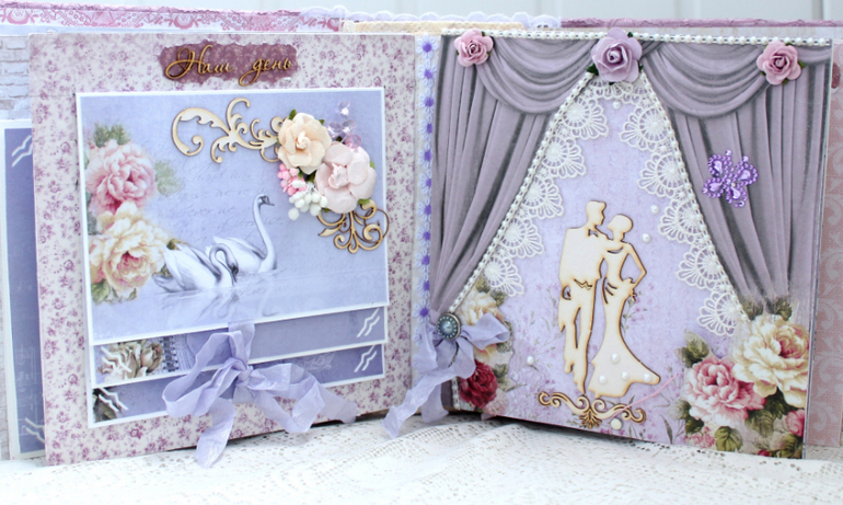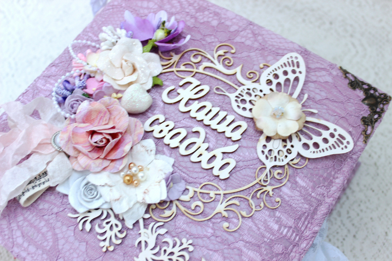 Альбомы СвадебныеПривет всем) А я к вам со свадебным альбомом в сиренево-розовых тонах) Формат альбома 20х20, толщина альбома 11 см, на 6 разворотов ( 12 страниц+ дополнительная откидная страница), рассчитан на 60 фотографий. Кружевная обложка, множество цветов Prima, чипборда, кружевных элементов, лент и др. украшений. Альбом есть в наличии)