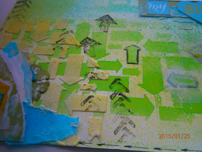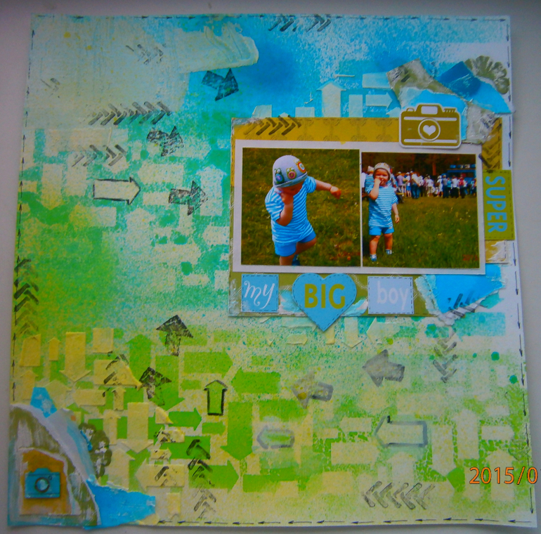 Хочу критики!!!Глаза бояться,а руки делают. Замахнулась я на третий альбом для сына. Первая страничка готова.Очень захотелось попробовать микс-медиа.Использовала трафареты,спреи,текстурную пасту,штампы.