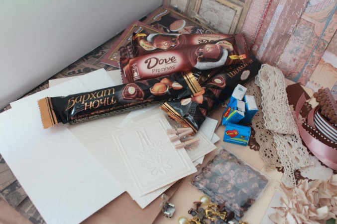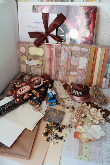 ИгрыВ самом прямом смысле - шоколадным!!!!! ммммм сколько вкусняшек было - я как неисправимый сладкоешка, была просто в шоке от такого количества! ну а скрапостей сколькооооо - мой хомяк был в шоке: Бумажечка, ленточки, подвесочки, полубусинки, крафт-пакетики, цветочки (а ещё и чудные самодельные цветы - они же самодельные, да?)