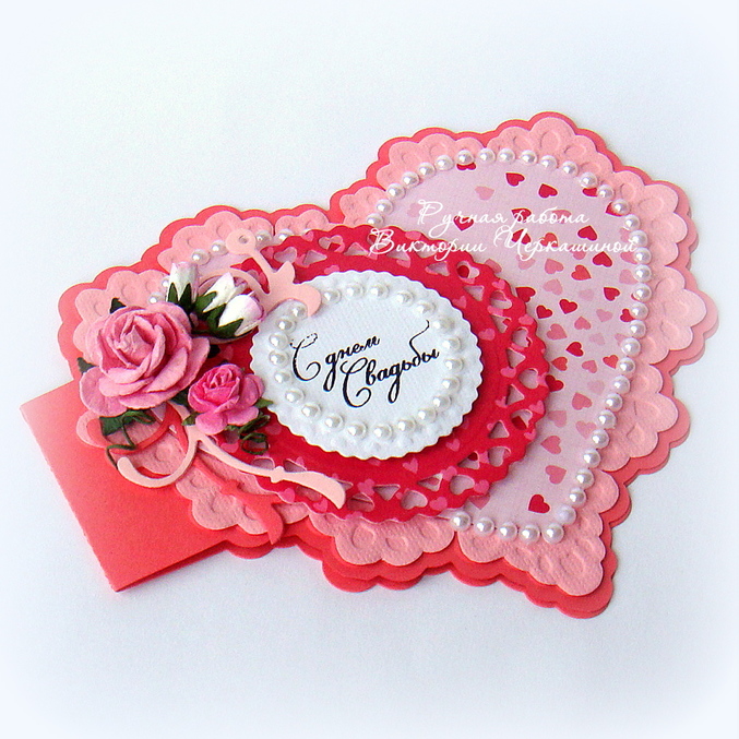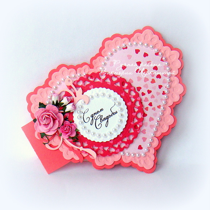 Меня накрыло волной свадебной тематики! И я вовсю делаю работы приуроченные именно этому торжеству. И сегодня снова главный символ любви и семейного счастья - сердце. Очень сочное и яркое! Поначалу хотелось назвать открытку "Свадьба в Малиновке" (я ведь люблю придумывать своим рукоделкам интересные "имена"), но потом, порывшись в словарях, я поняла, что малинового цвета не так уж много в моей работе (больше оттенков розового). А малиновый входит в палитру оттенков красного. Потому и название такое - "Розовое счастье"!