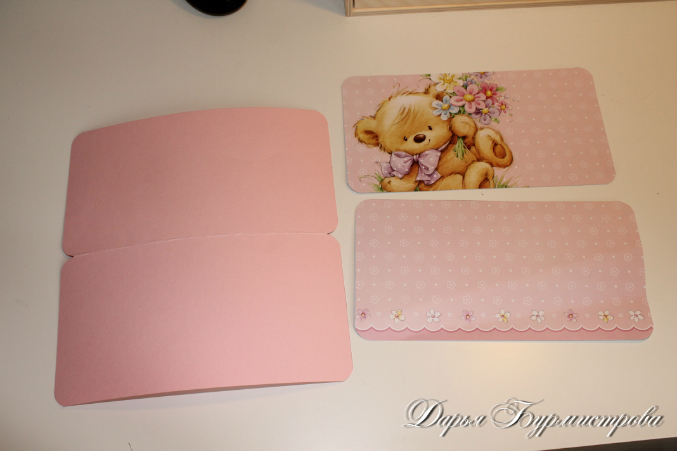 Вырезаем прямоугольник желаемого размера из кардстока или акварельной бумаги.Сгибаем пополам.Можно обработать углы дыроколом края.Вырезаем из бумаги с рисунком 2 прямоугольника,которые на 2мм меньше заготовки с каждой стороны.Также можно обработать края дыроколом,желательно прострочить по контуру на машинке.Приклеиваем сверху.Теперь займемся внутренностями-вырезаем прямоугольник,который по ширине на 2 мм с каждой стороны меньше основы,а по высоте меньше наполовину.Обрабатываем углы дыроколом и одну длинную сторону дыроколом края.Желательно прострочить на машинке.Приклеиваем кармашек.Все,основная работа готова!