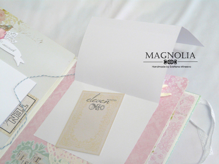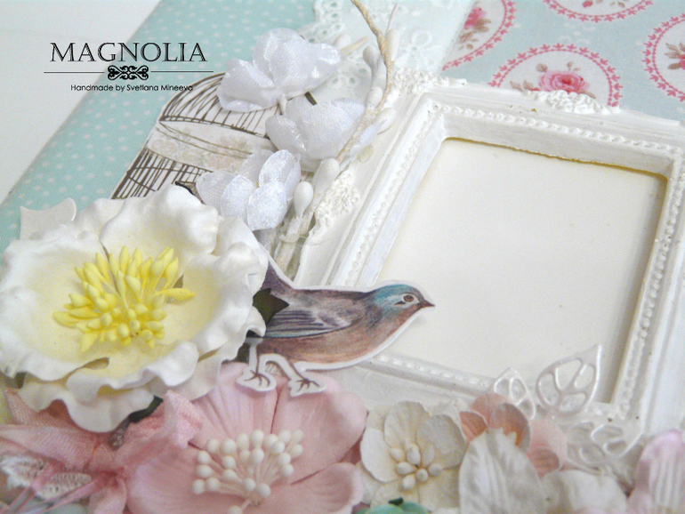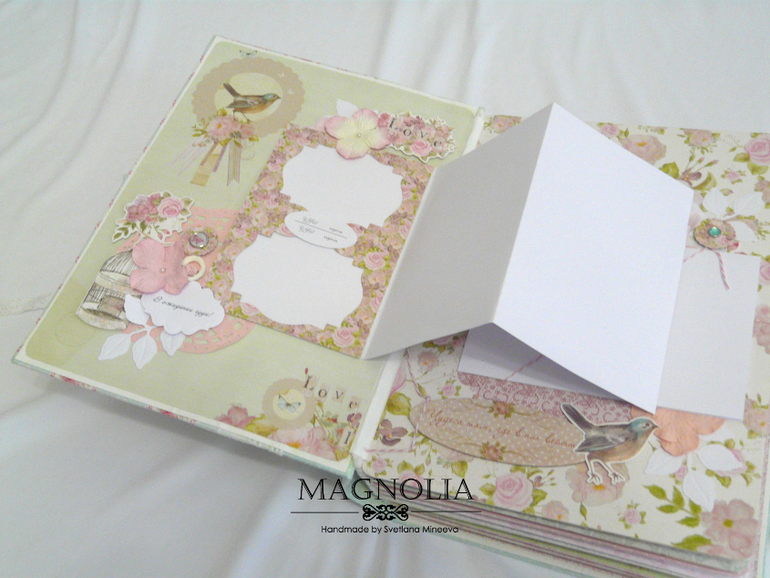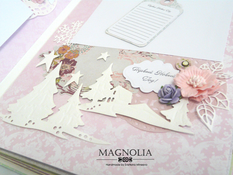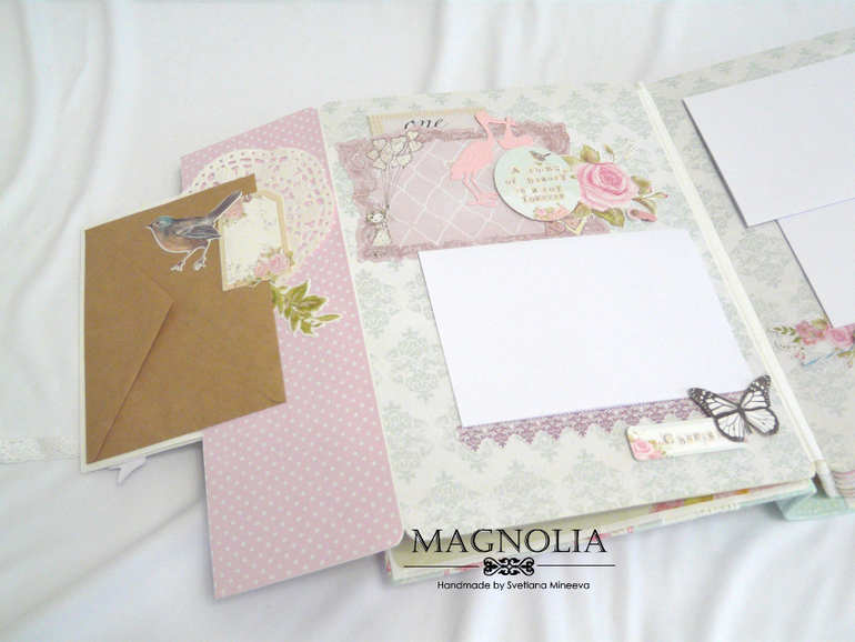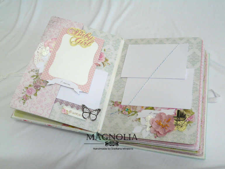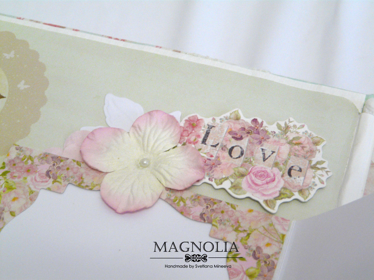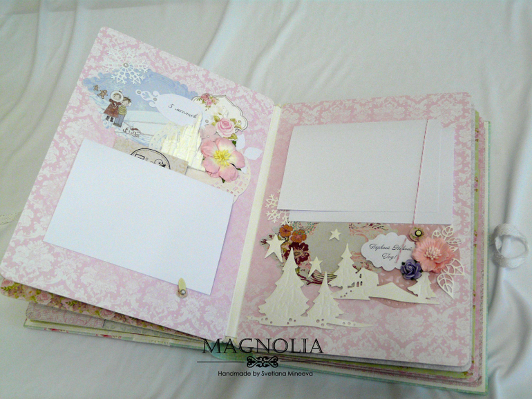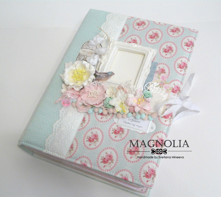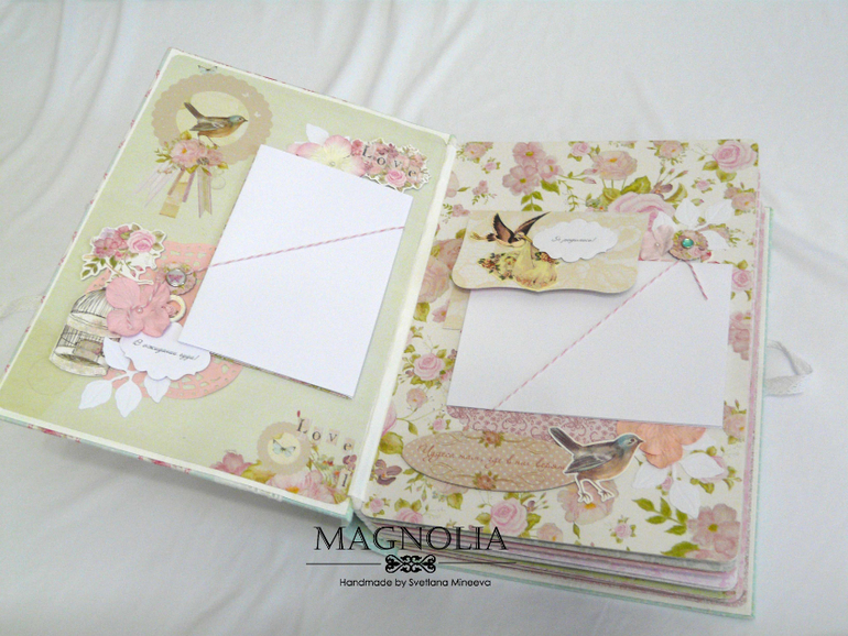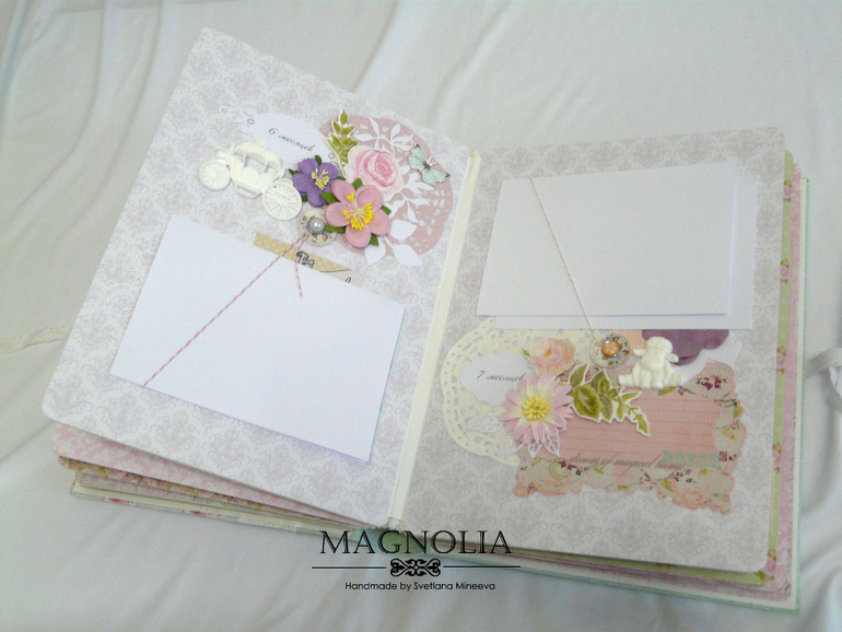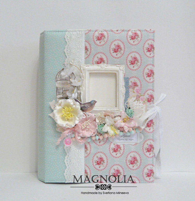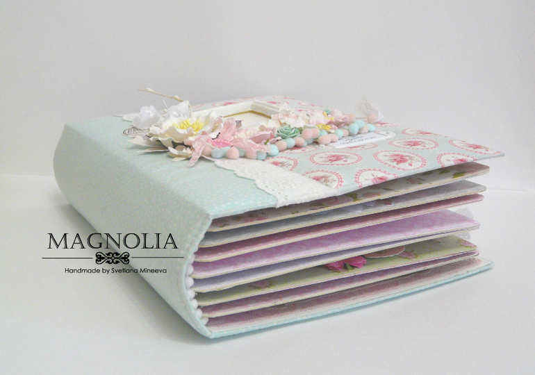 В основе страниц бумага из коллекции True Romance от Kiser Craft и немного листов от Fleur Design. Формат А4, 8 разворотов или 16 страниц, переплет по МК Е. Виноградовой. Обложка обтянута натур.хлопком, уголки альбома защищены металлическими уголками. На лицевой стороне альбома есть рамочка для вставки небольшого фото. Подложки без уголков, под вклейку фотографий. Всего в альбом вмещает 83 фото формата 10*15 см.
