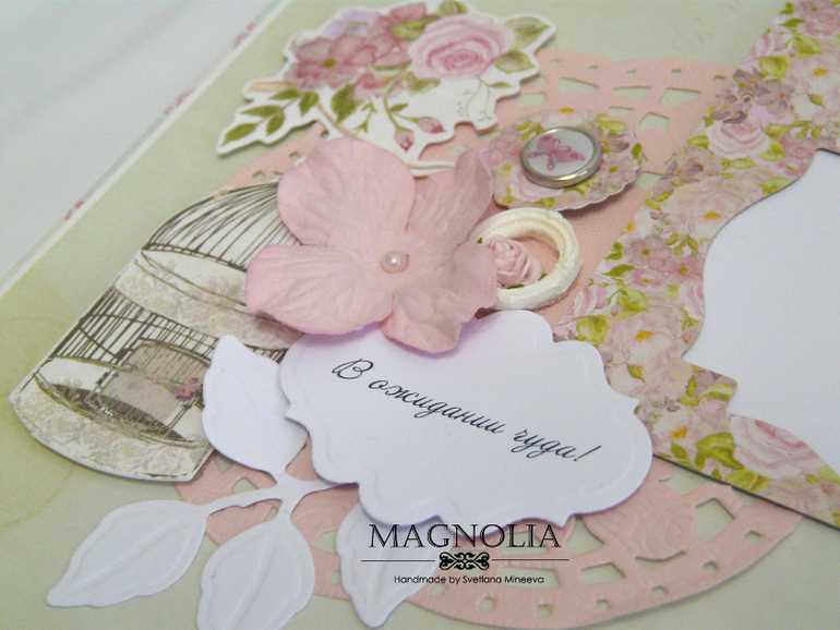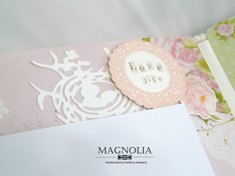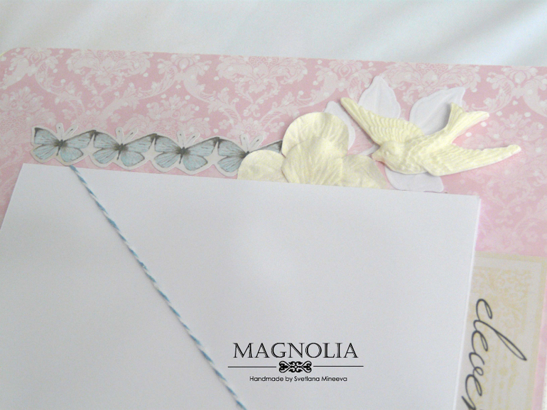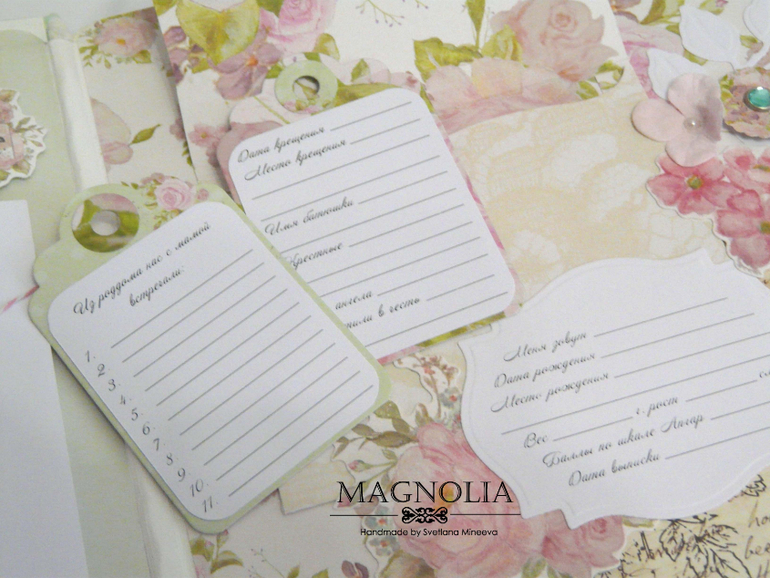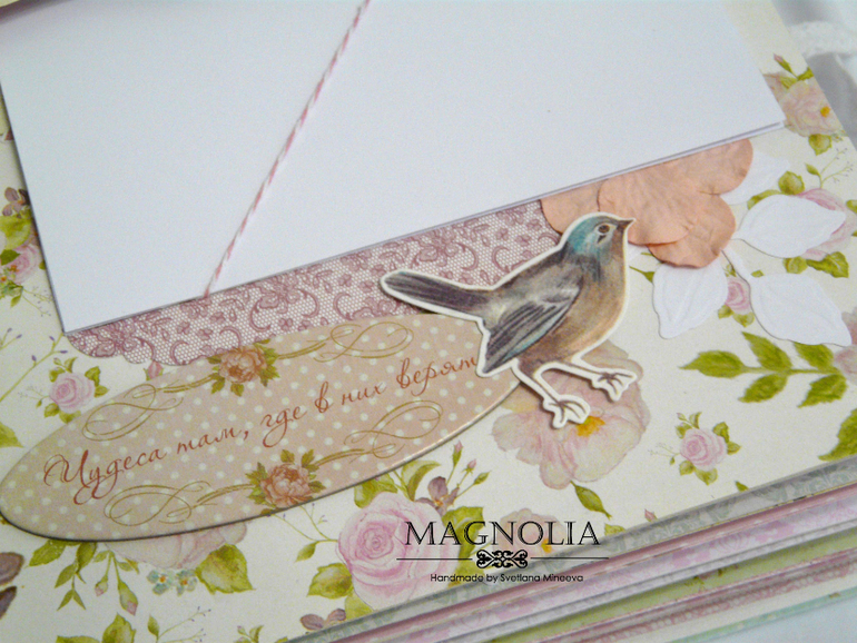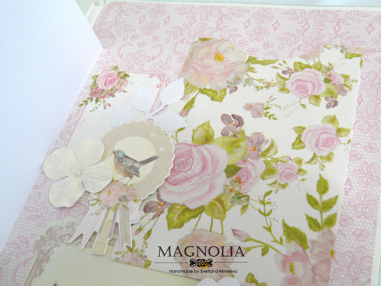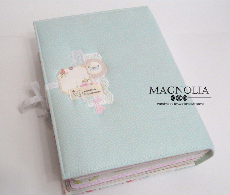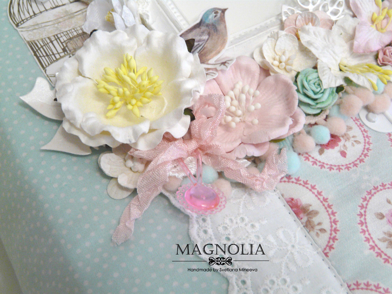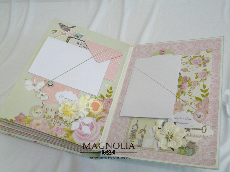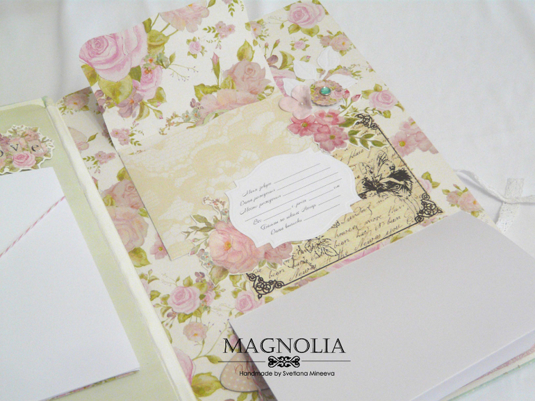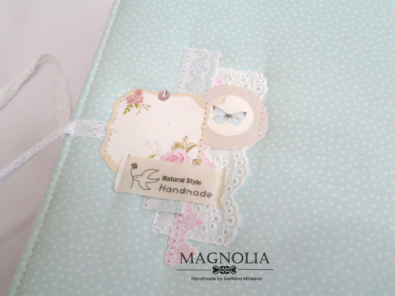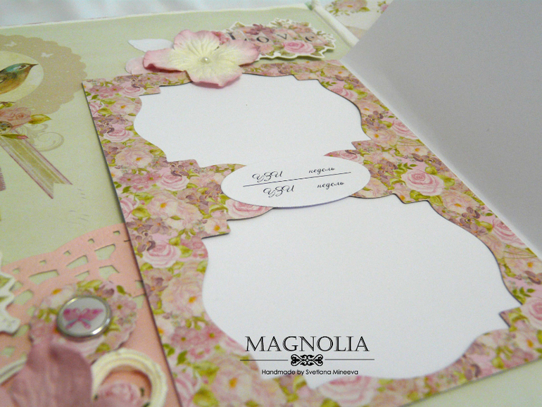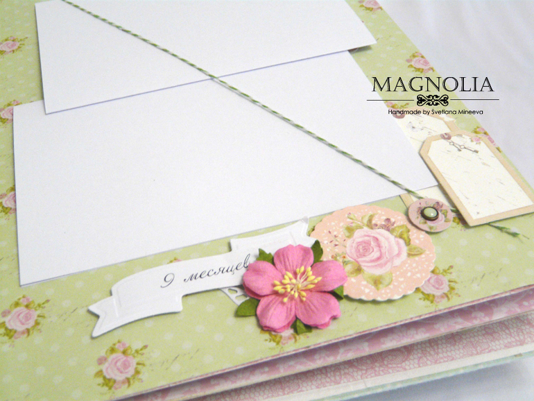 В основе страниц бумага из коллекции True Romance от Kiser Craft и немного листов от Fleur Design. Формат А4, 8 разворотов или 16 страниц, переплет по МК Е. Виноградовой. Обложка обтянута натур.хлопком, уголки альбома защищены металлическими уголками. На лицевой стороне альбома есть рамочка для вставки небольшого фото. Подложки без уголков, под вклейку фотографий. Всего в альбом вмещает 83 фото формата 10*15 см.