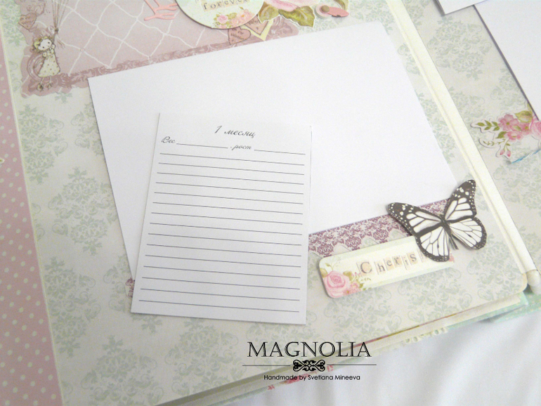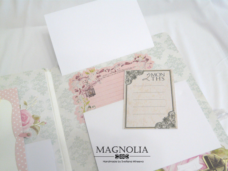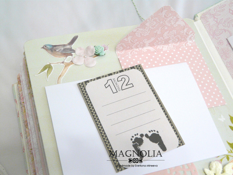 В альбоме выделена страница под фото беременности, предусмотрены два кармана для фото УЗИ, далее каждая страница посвящена одному месяцу из жизни малышки, плюс выделена страница для фото с первого Нового года и первого Дня Рождения. есть кармашки для хранения бирочки, локона, каких-то мелочей с дня рождения. Для каждого месяца есть карточка для записей, а так же карточки для отметки роста зубок, веса и роста, достижений малышки за год, обводки ножки и ладошки.В общем-то альбом достаточно простой в оформлении.