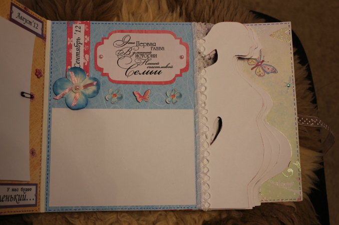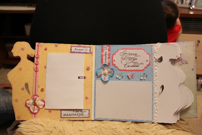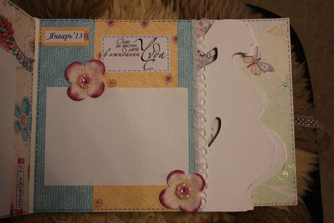 Альбом делала для беременной сестры-близняшки в подарок на день рождения. Сама мечтала о таком, но в итоге, как это бывает: сапожник без сапог. Делала относительно не долго, 2 недели по ночам )) Но, как у меня обычно бывает, все равно все доделывала в последний момент, буквально перед вручением. И то, не успела украсить силуэт беременной, поэтому она просто белая...
