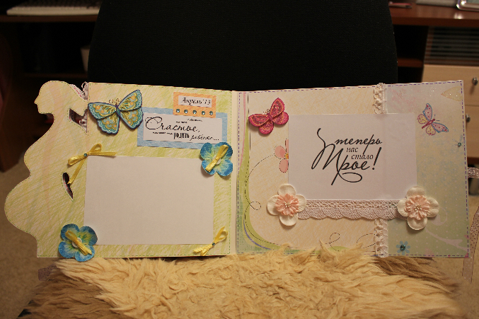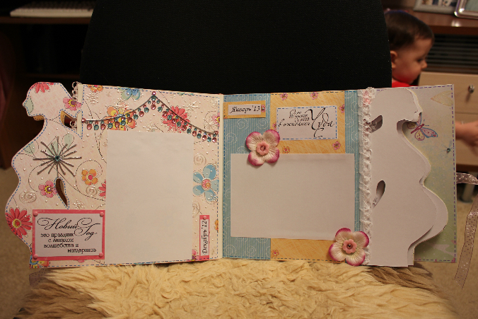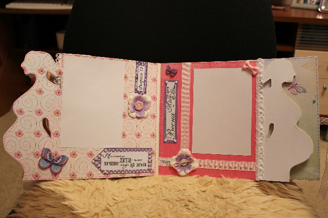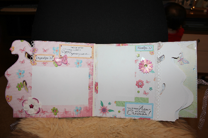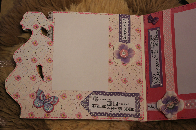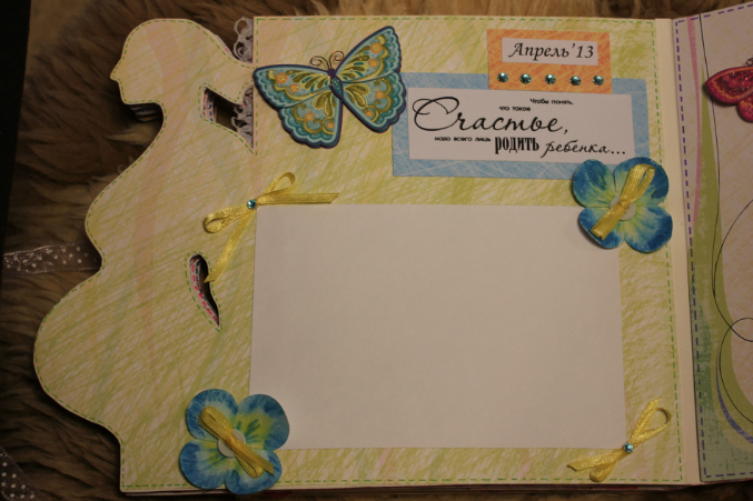 Апрель. Предпорлагалось, что малышка родится в апреле. Но дочка сестры решила сама, когда появиться на свет (родилась на месяц раньше) . Теперь надо будет подумать, как что переделать, чтобы альбом смотрелся законченным.