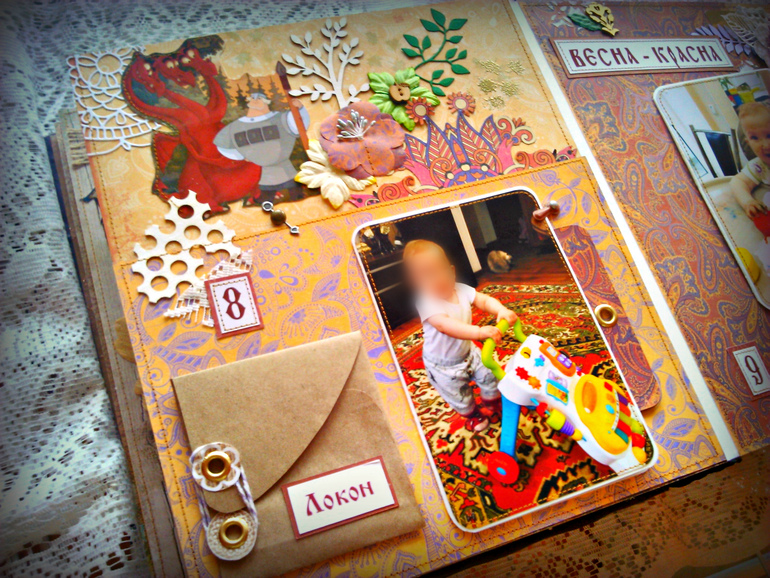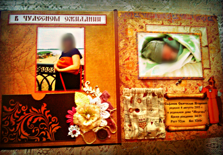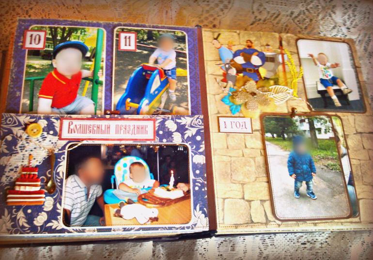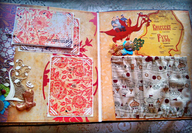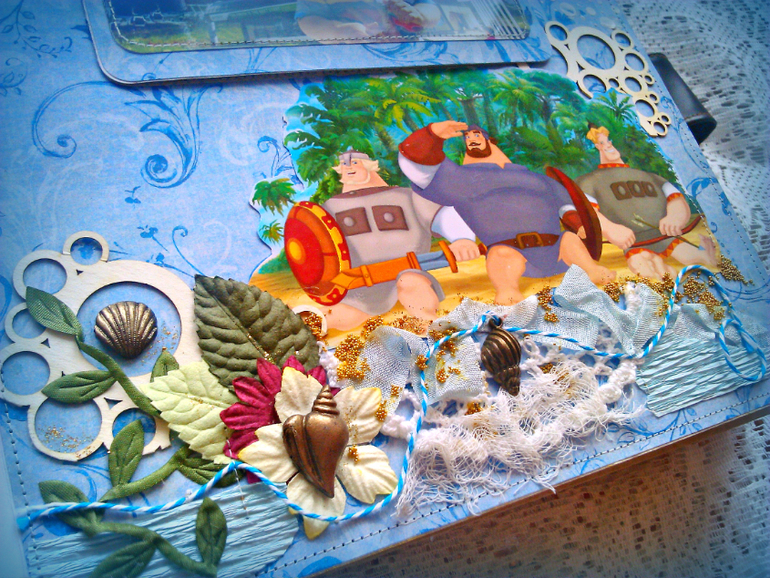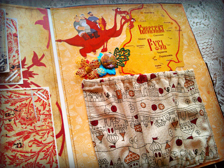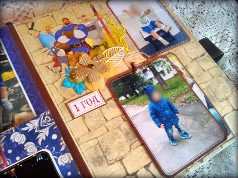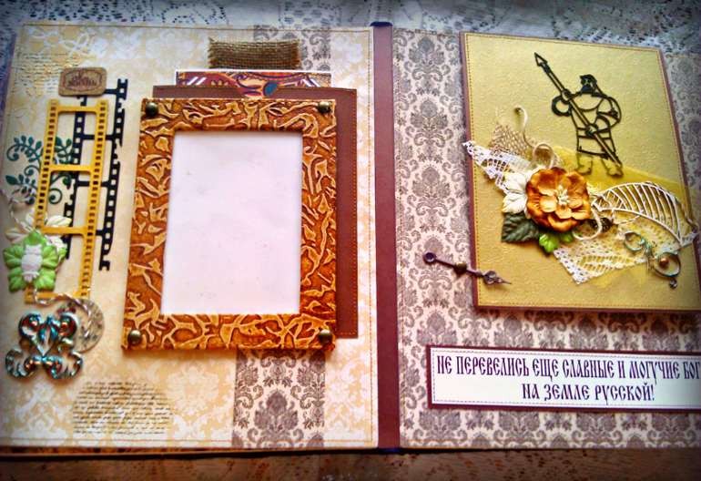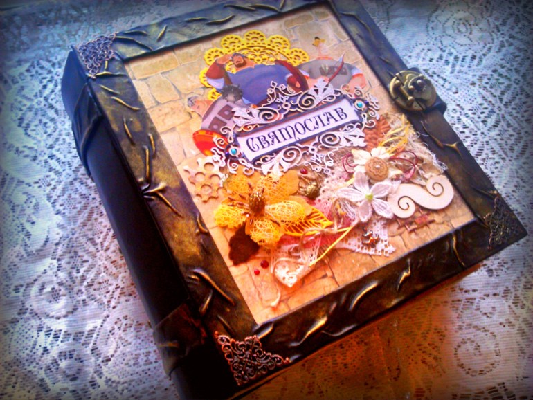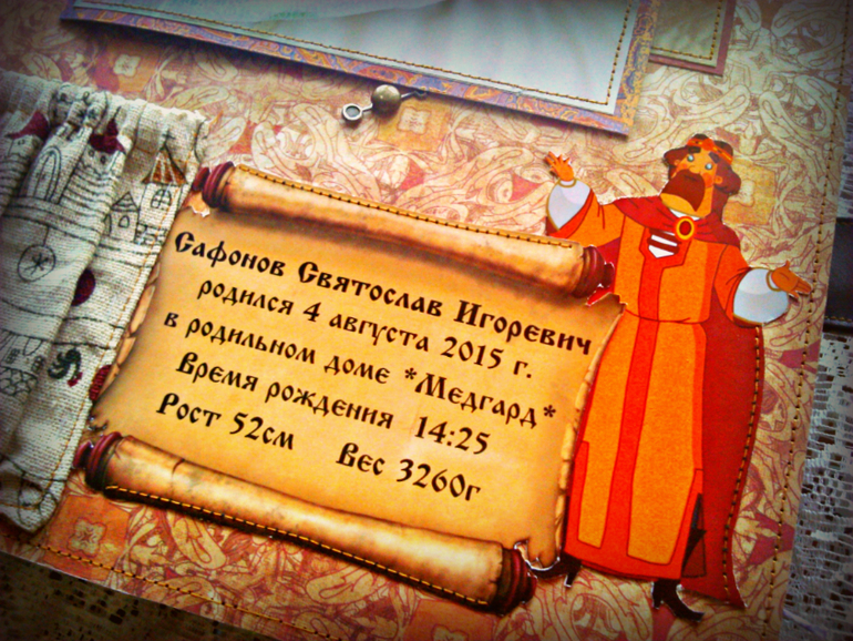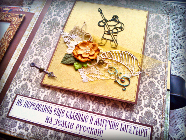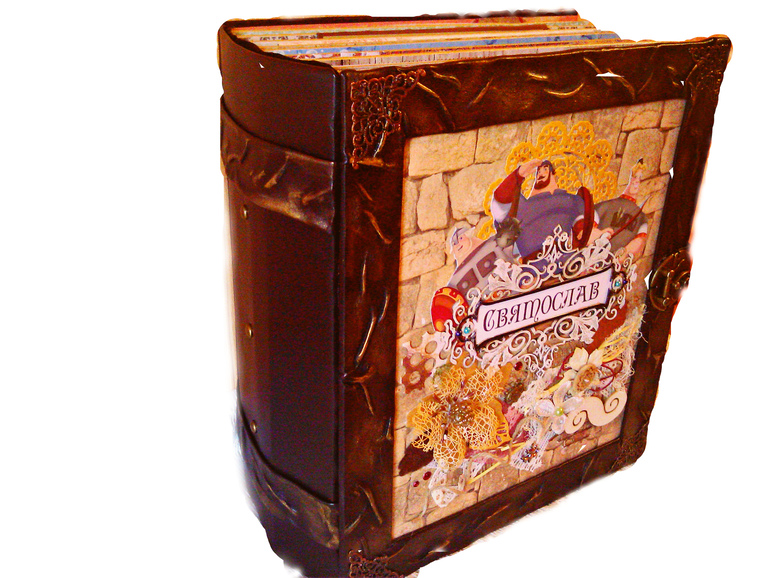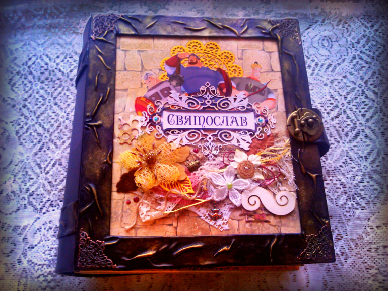 Альбомы ДетскиеЗдравствуйте, дорогие рукодельницы! Представляю Вашему вниманию тематический большой альбом для мальчика Святослава Игоревича, над которым я трудилась около двух месяцев. Отдельное спасибо хочется сказать заказчице Светлане за терпеливое ожидание и свободу в творческом исполнении и реализации всех задумок и идей. Имя мальчика само натолкнуло на идею взять Трех Богатырей Киевской Руси за основную тему альбома. Иллюстрации были взяты из одноименного мультфильма. Данную тему поддерживают такие детали как: славянский шрифт, кармашки из натурального льна, анкеры в виде стрелок, фурнитура (петли, замки, металлические уголки), а также принт бумаги. Кстати, о ней: подходящего к этой тематике бумаги, отвечающей нашим с заказчицей требованиям по пастельной цветовой гамме, к сожалению, не оказалось, поэтому мне пришлось подбирать все по листу. Каждый разворот в альбоме оформлен в соответствии с темой фотографий, их цветовым решением. В итоге, получившимся результатом я очень довольна и могу утверждать, что этот альбом - действительно моя гордость. Это из той серии, когда берешь в руки и понимаешь: ВЕЩЬ!! Он тяжелый и очень большой (20 страниц, размер 25*29см, толщина корешка 14 см)