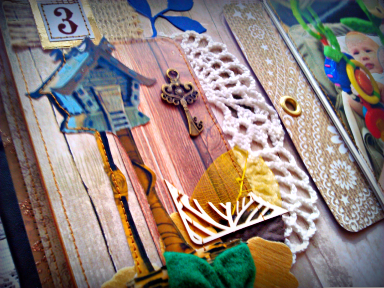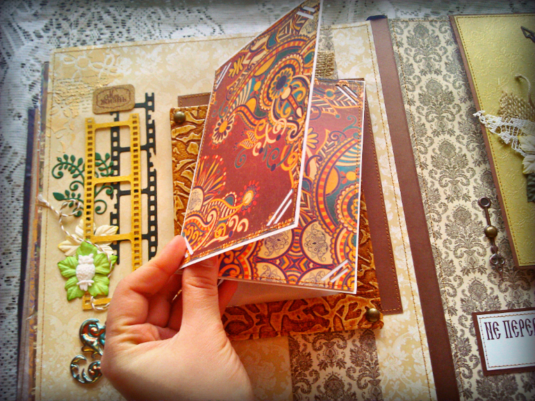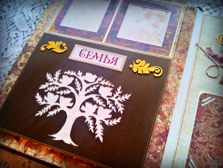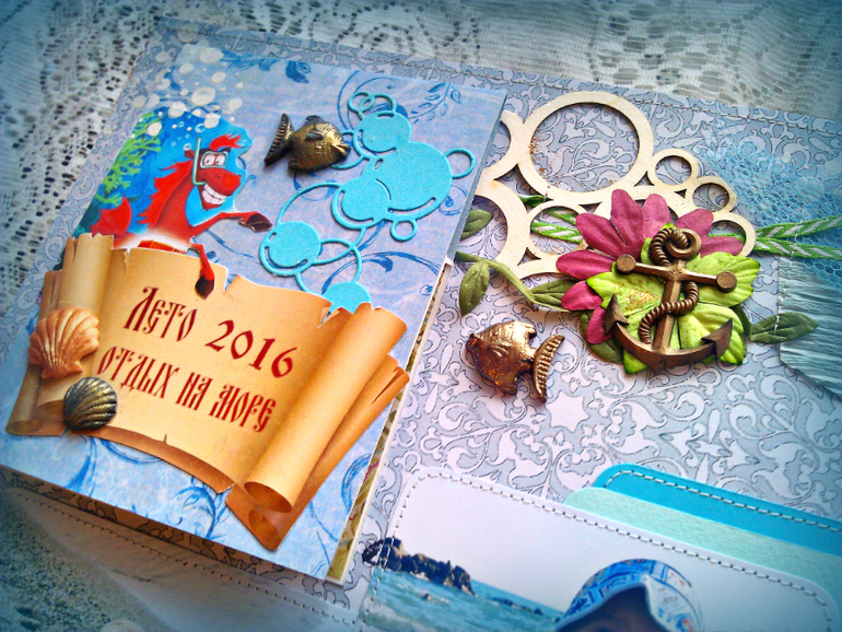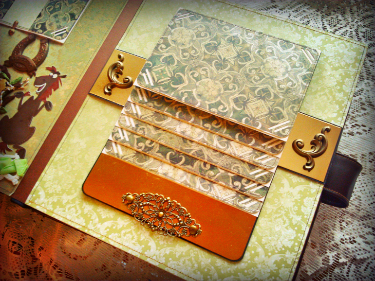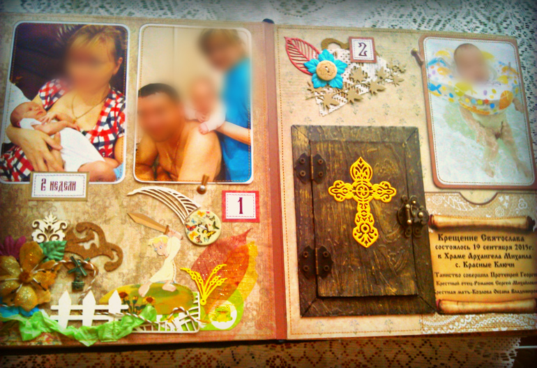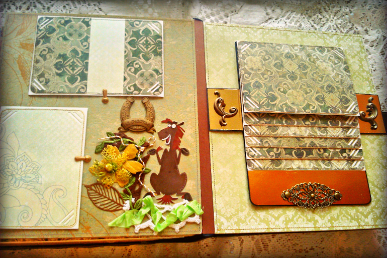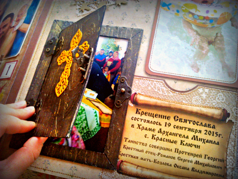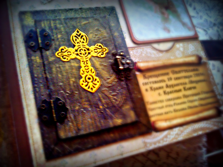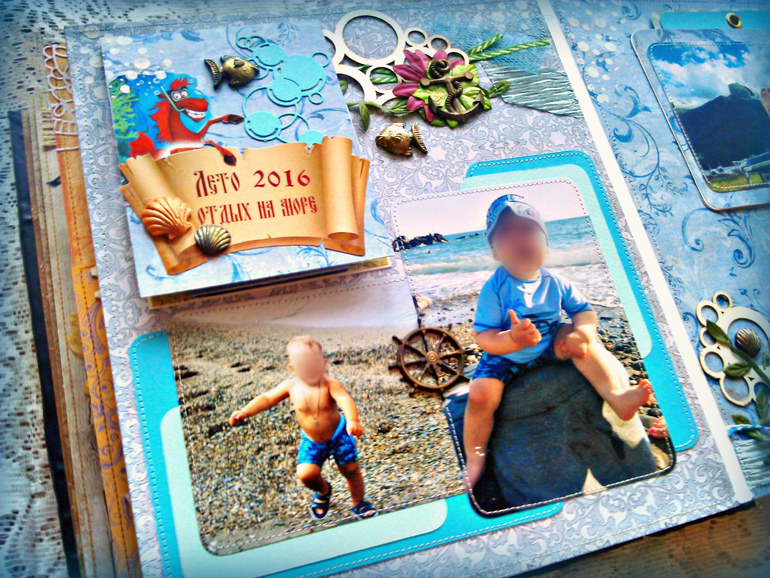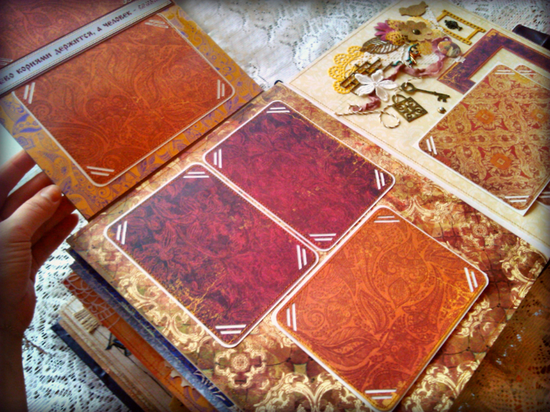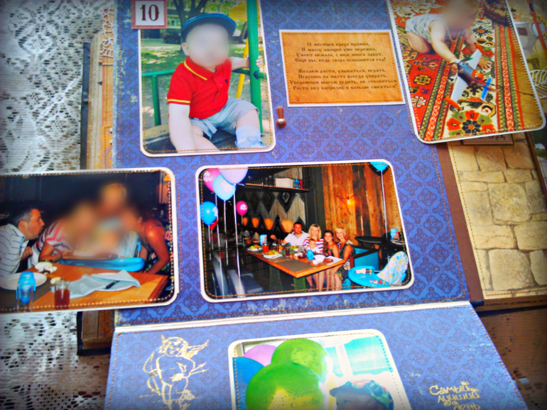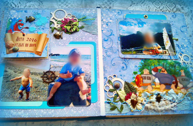 Альбомы ДетскиеЗдравствуйте, дорогие рукодельницы! Представляю Вашему вниманию тематический большой альбом для мальчика Святослава Игоревича, над которым я трудилась около двух месяцев. Отдельное спасибо хочется сказать заказчице Светлане за терпеливое ожидание и свободу в творческом исполнении и реализации всех задумок и идей. Имя мальчика само натолкнуло на идею взять Трех Богатырей Киевской Руси за основную тему альбома. Иллюстрации были взяты из одноименного мультфильма. Данную тему поддерживают такие детали как: славянский шрифт, кармашки из натурального льна, анкеры в виде стрелок, фурнитура (петли, замки, металлические уголки), а также принт бумаги. Кстати, о ней: подходящего к этой тематике бумаги, отвечающей нашим с заказчицей требованиям по пастельной цветовой гамме, к сожалению, не оказалось, поэтому мне пришлось подбирать все по листу. Каждый разворот в альбоме оформлен в соответствии с темой фотографий, их цветовым решением. В итоге, получившимся результатом я очень довольна и могу утверждать, что этот альбом - действительно моя гордость. Это из той серии, когда берешь в руки и понимаешь: ВЕЩЬ!! Он тяжелый и очень большой (20 страниц, размер 25*29см, толщина корешка 14 см)