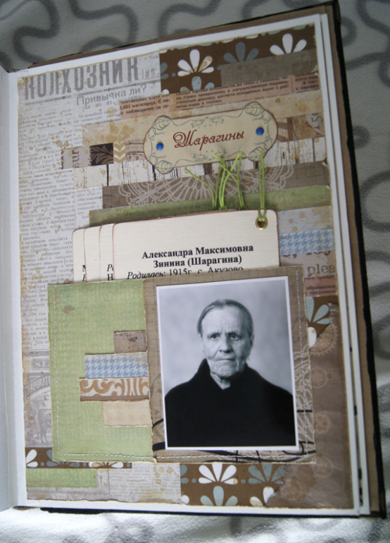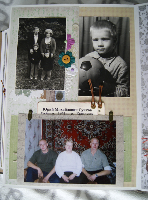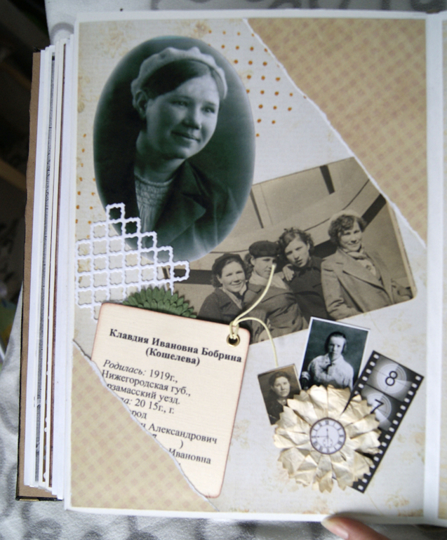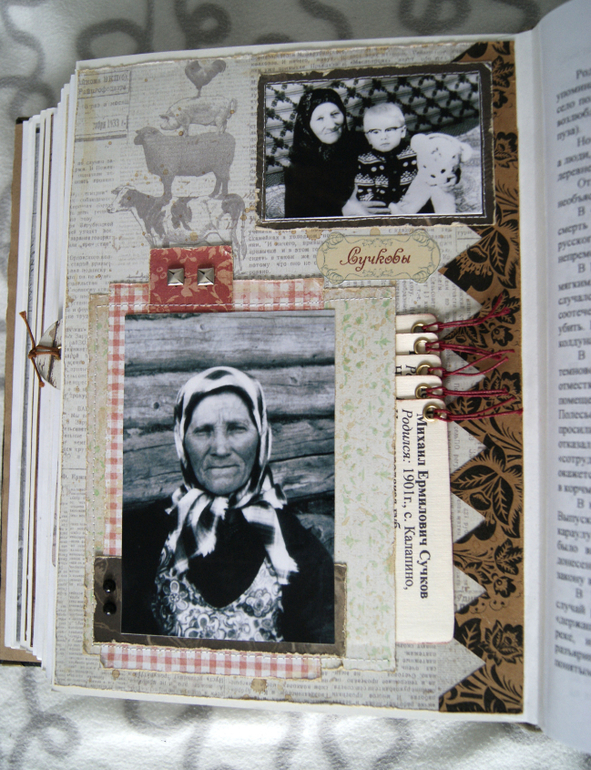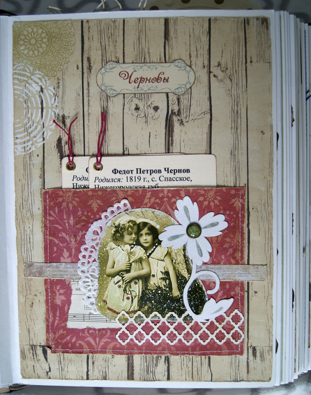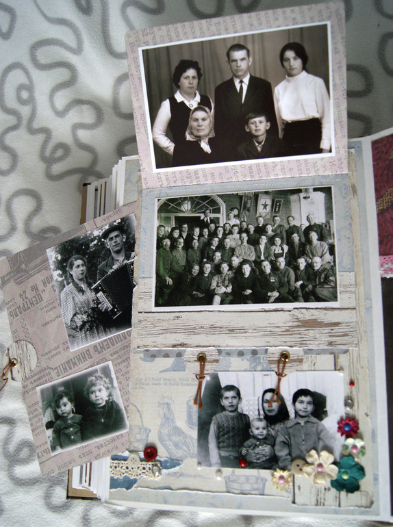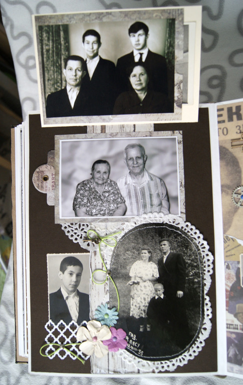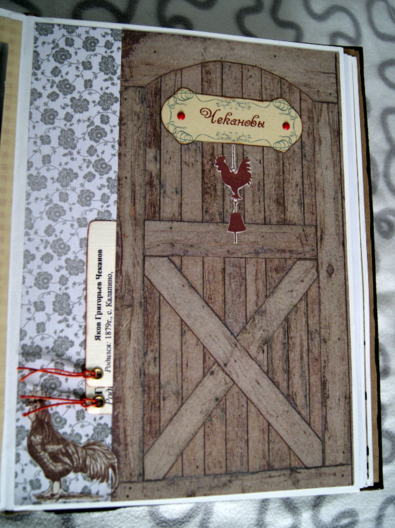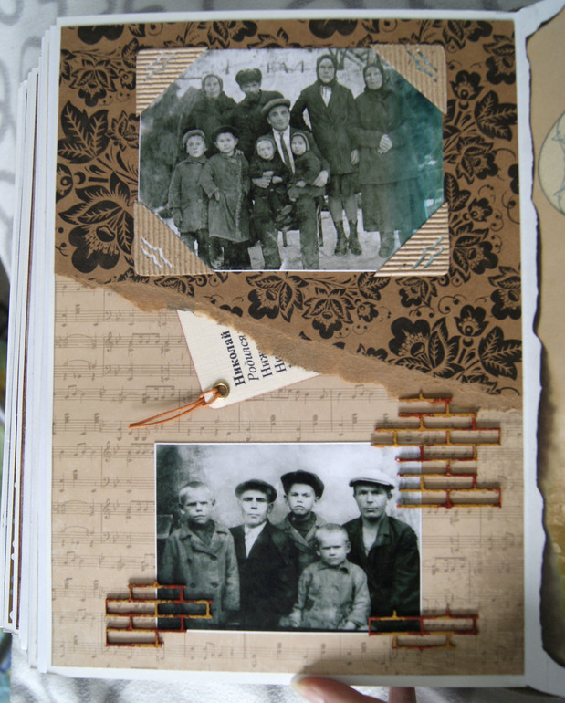 Конечно это не скрап альбом, это скрап книга! Материал обложки натуральная замша и кожа. Собраны не только фото предков, но и по каждой фамилии составлен небольшой рассказ, приложены архивные документы. Поэтому толщина по корешку 14 см.