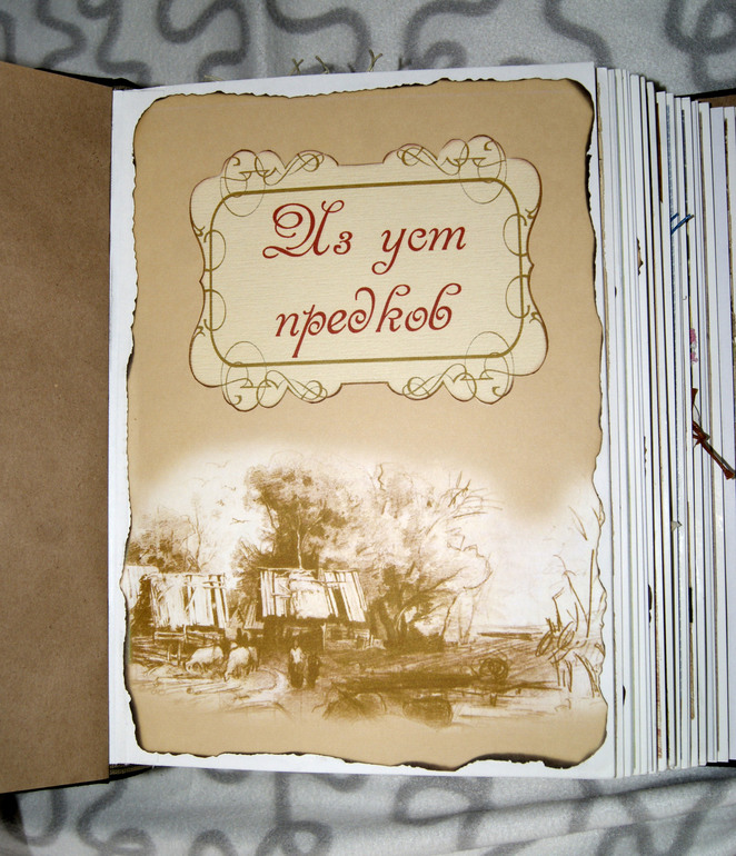 Форзацы обычная крафт бумага, каждому разделу предшествует заставка с заголовком, картинки подобраны по теме. Из уст предков это название всей книги