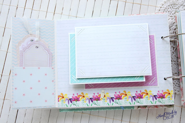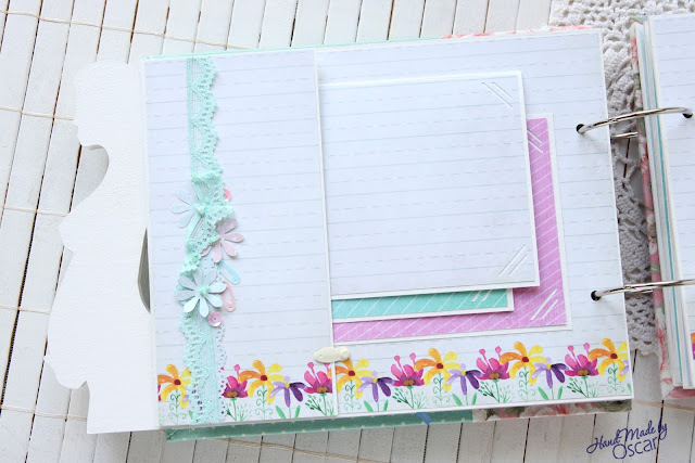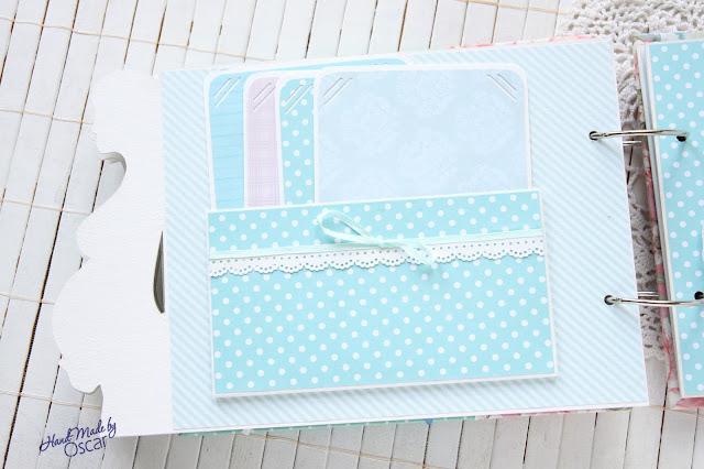 Так как заказчица попросила сделать мятно-розовый альбом, бумагу собирала из разных коллекций, в основном Скрапмир.