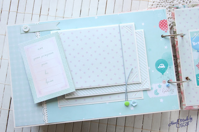 Немного цифр: альбом на 7 разворотов, 6 посвящены трепетному времени ожидания малыша и последний - рождению малыша и первым фото. Размер альбома 29*19, поместится 47 фото
