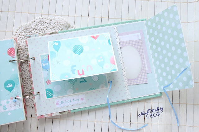 Альбом получился очень нежный, учла все пожелания будущей мамочки, ткани для обложки и бумага для разворотов подбирались под интерьер детской, ведь он не только сохранит много фото, но и будет украшать собой комнату)))