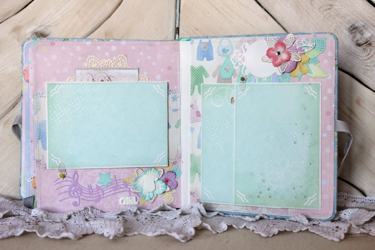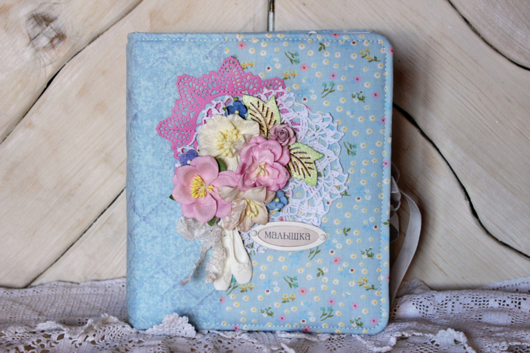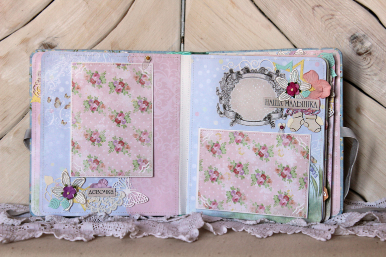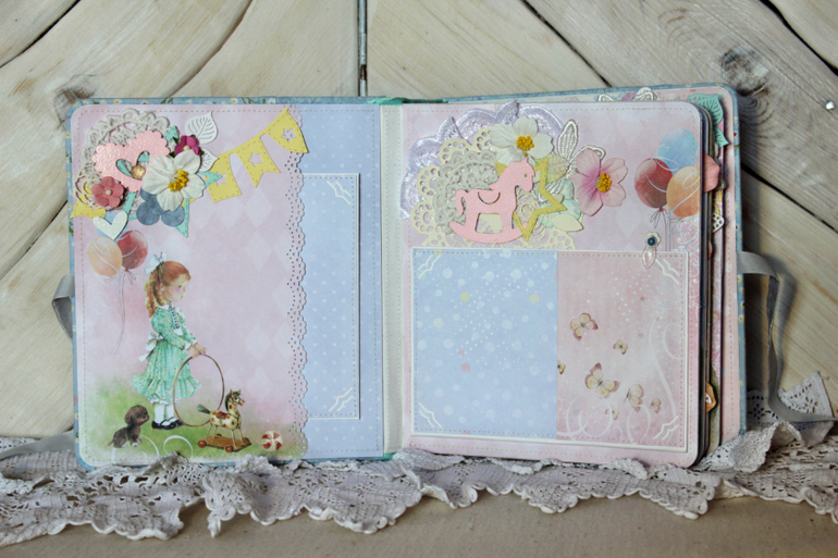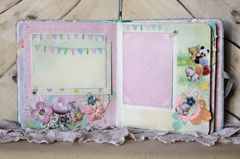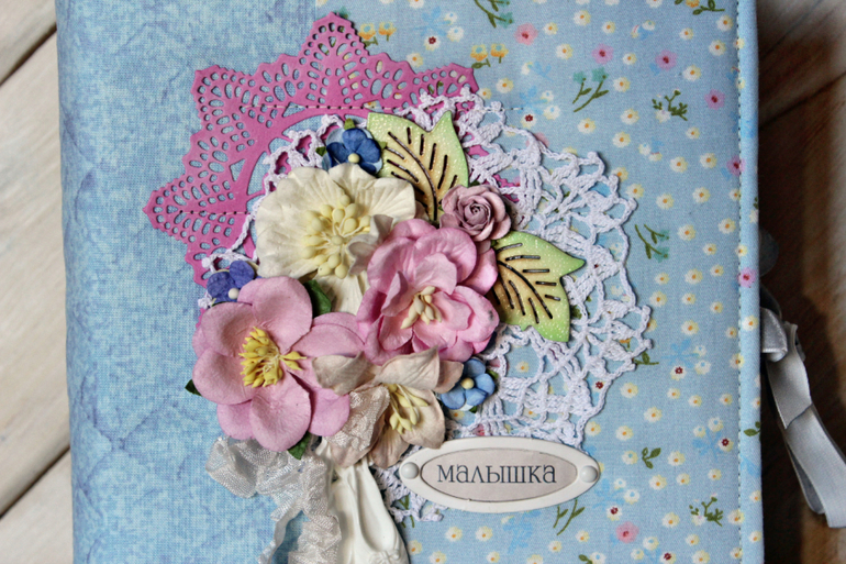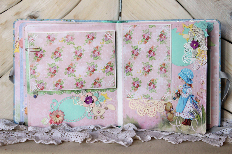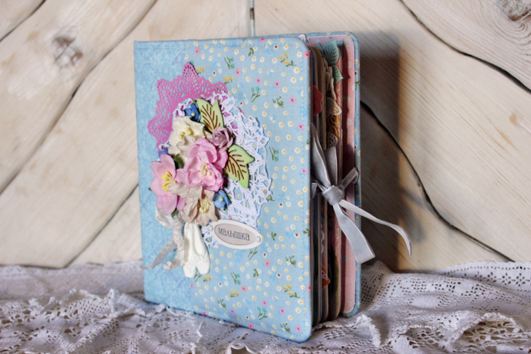 Альбомы ДетскиеВсем привет! Я сегодня с новым альбомом. Размер его 20 х 17 см. Получился очень нежный на мой взгляд. Дался он мне, кстати говоря, не очень легко)))С самого начало все пошло не так, сначала намочила листы, когда цветы поливала. Очень расстроилась по этому поводу, потому что бумага была немного испачкана землей. После этого она долго лежала у меня в закромах, но недавно я ее нашла и все же решила сделать из нее альбомчик. Смотрим что получилось.