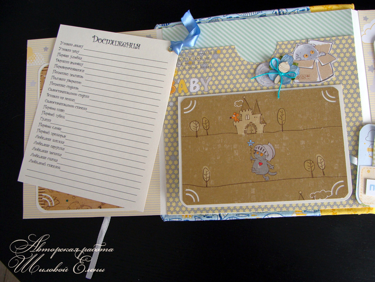 Альбомы ДетскиеФотоальбом выполнен полностью вручную с нуля. В альбоме можно разместить 50 фото. Множество потайных кармашков и разворотов с разными приятностями, интересно рассматривать. Фотоальбом так же содержит: метрику, бирочку с окошком для узи, бирочку с окошком для локона, 6 карточек для записей, карточку для отпечатка ручки и ножки, карточку-схему прорезывания зубов с разлиновкой для записей об особенностях прорезывания, таблицу роста и веса по месяцам, таблицу развития навыков малыша, страницу для других заметок о развитии Вашего сыночка. (больше фото у меня в альбоме)
