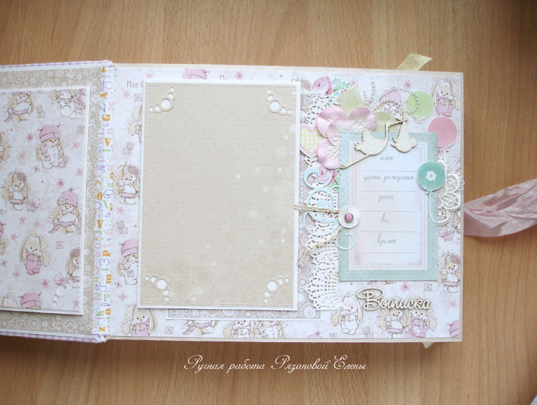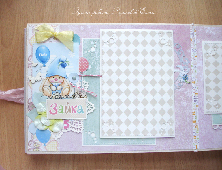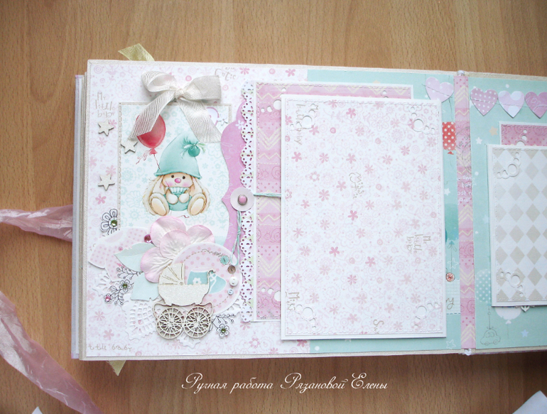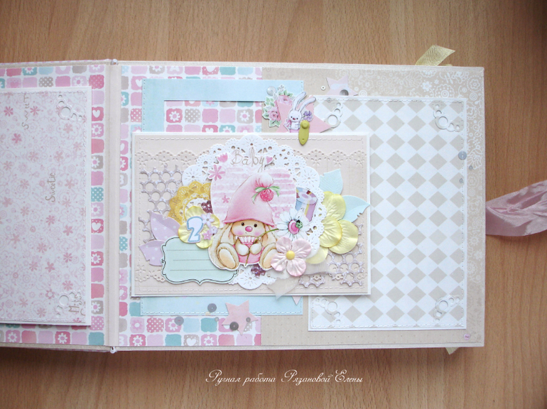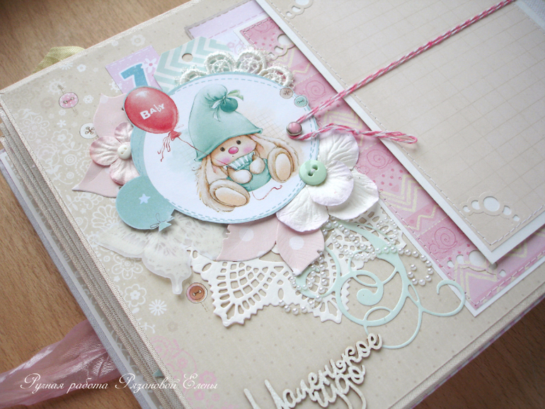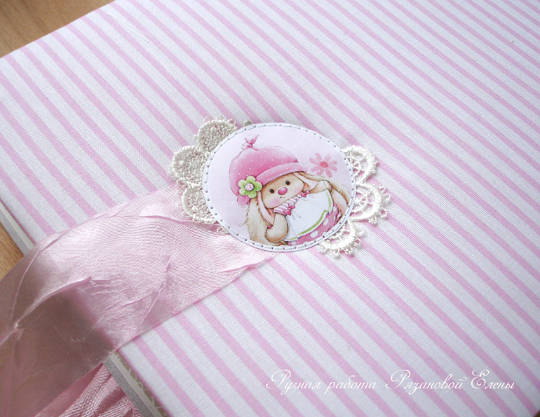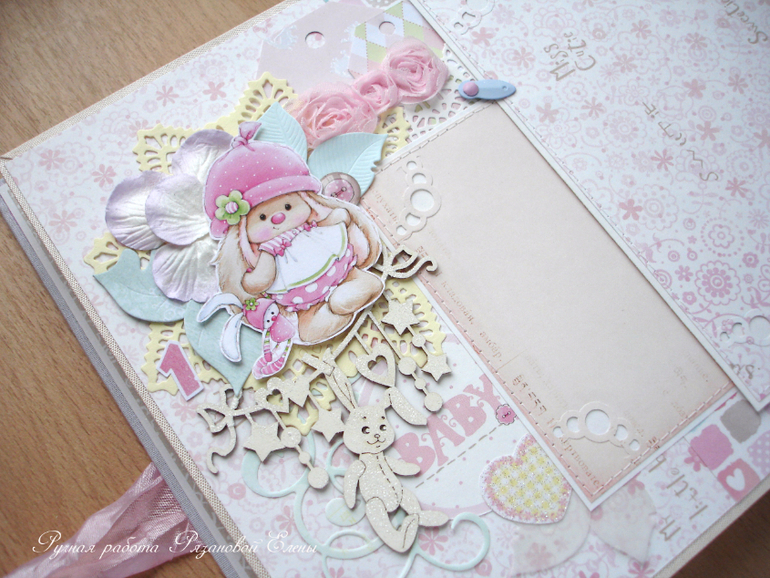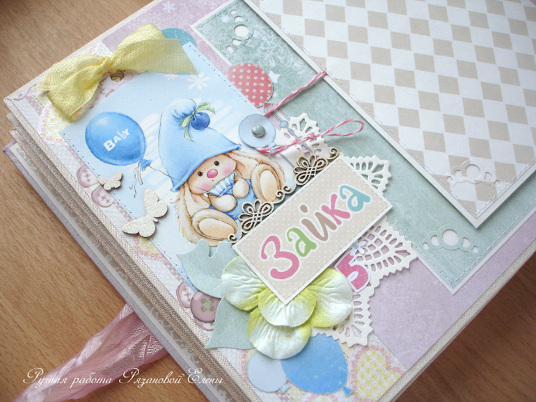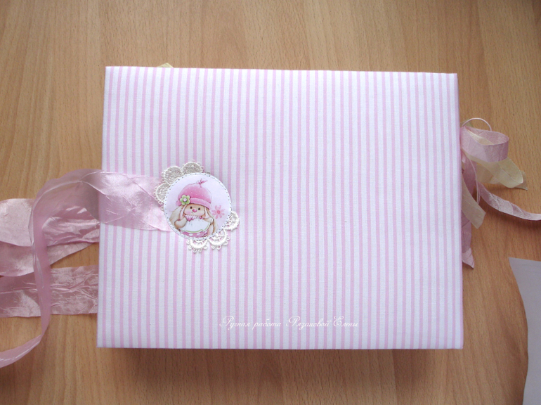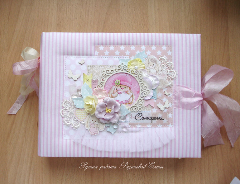 Альбомы ДетскиеА я сегодня с альбомчиком с зайками_Ми для маленькой красавицы Самирочки. Альбом с тканевой обложкой, закрывается на широкую шебби-ленту, содержит 7 разворотов, размером 19*25см.