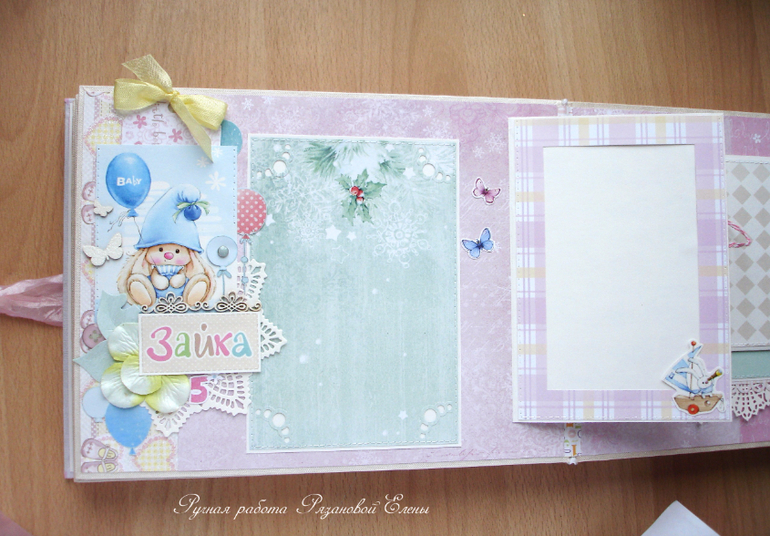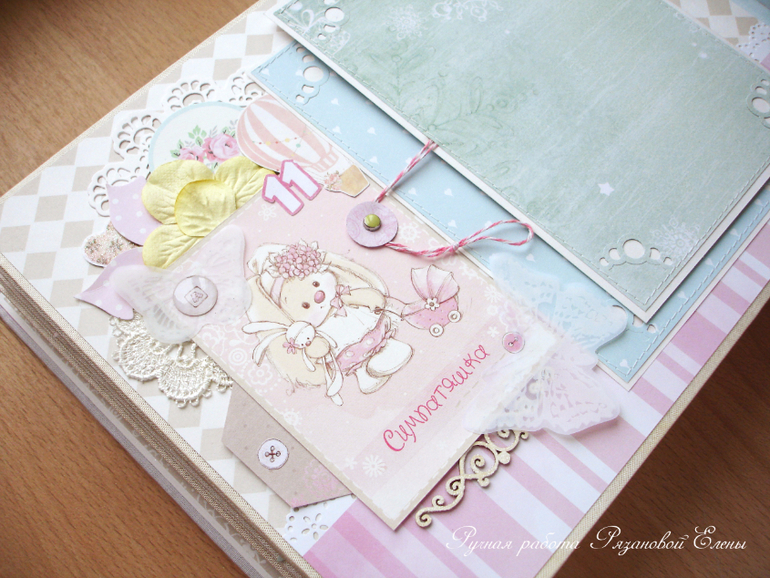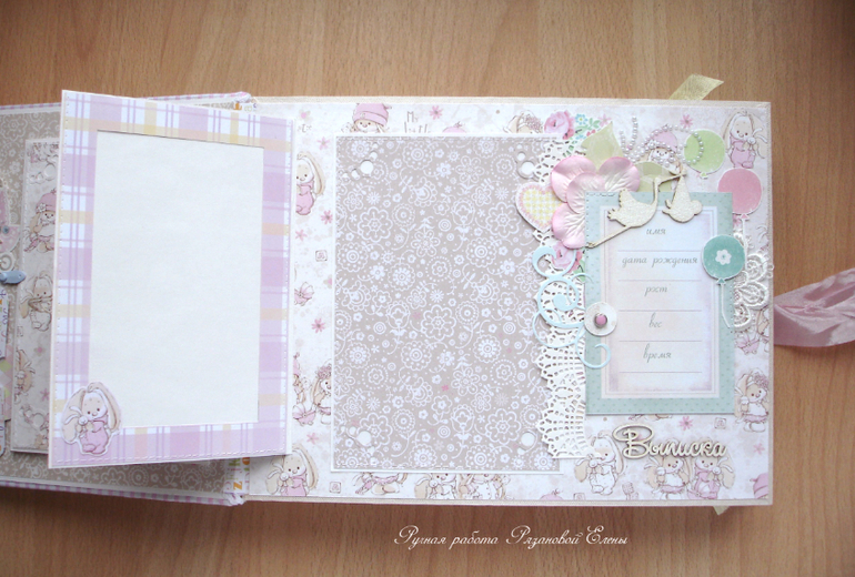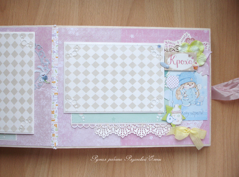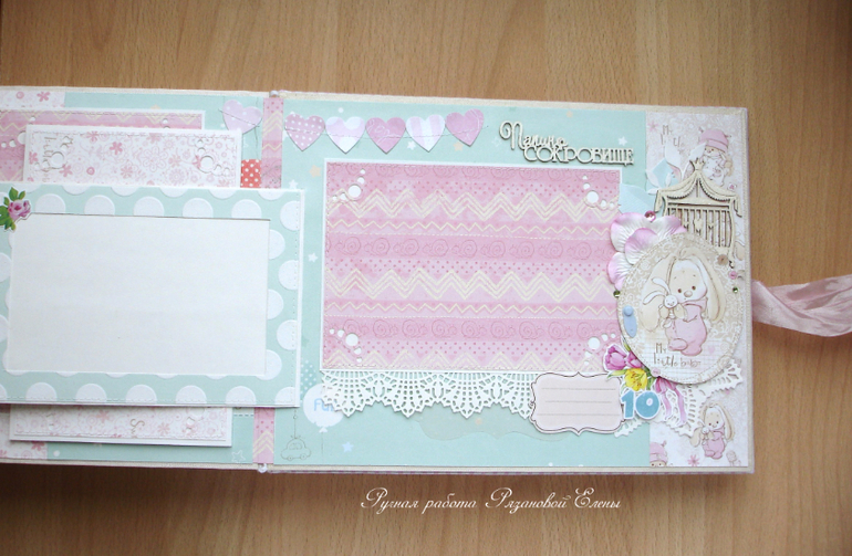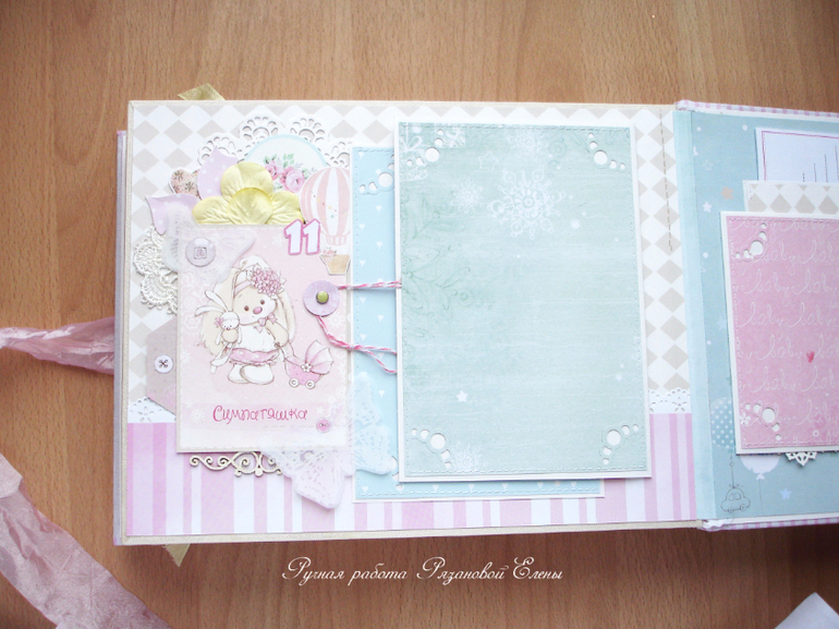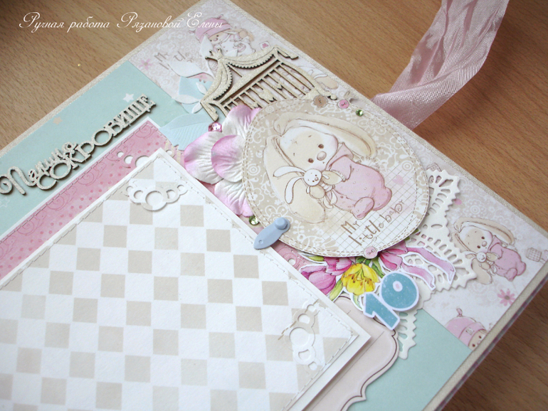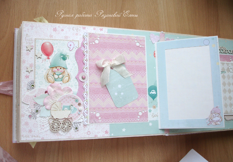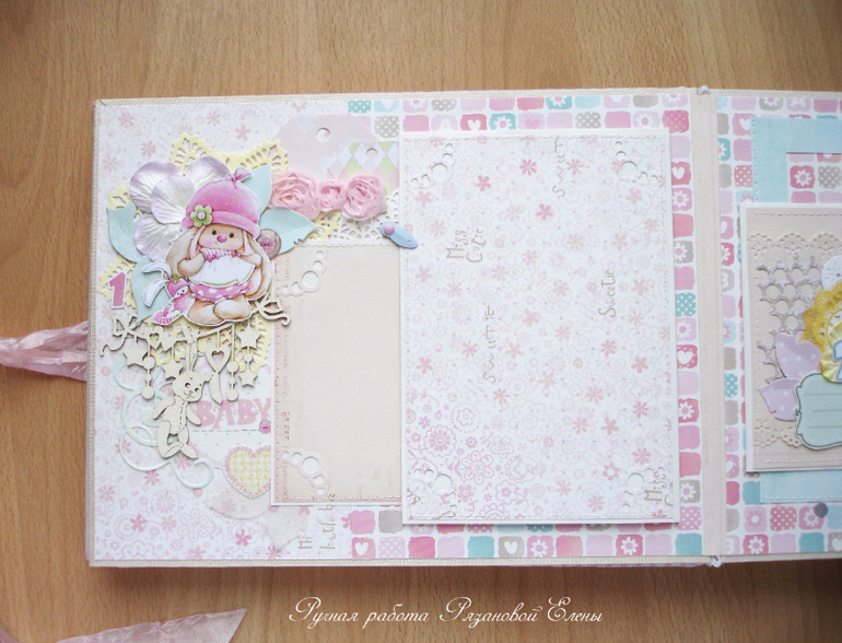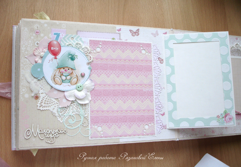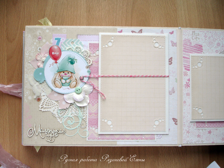 Альбомы ДетскиеА я сегодня с альбомчиком с зайками_Ми для маленькой красавицы Самирочки. Альбом с тканевой обложкой, закрывается на широкую шебби-ленту, содержит 7 разворотов, размером 19*25см.