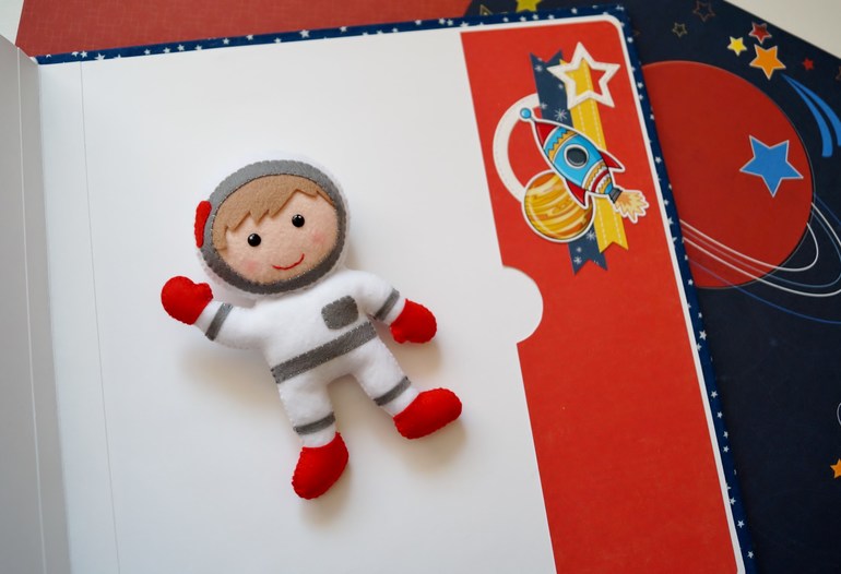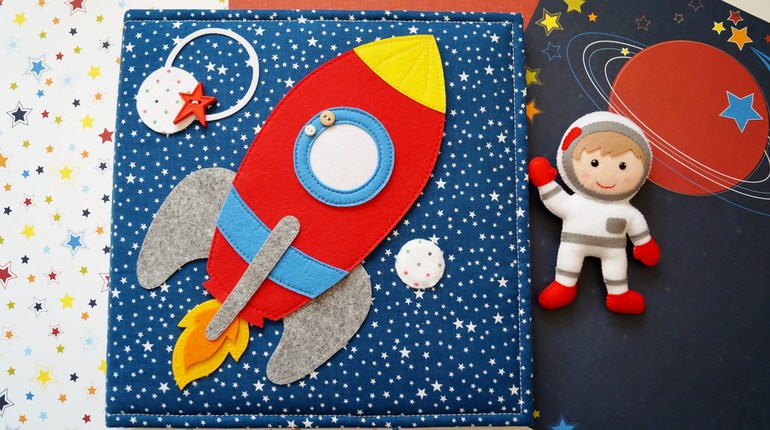 три страницы - оформлены, одна из них с использованием магнитных закрывашек, на форзацах - кармашки. Обложка))) ее по обычаю украшает фетровый декор, и необычный персонаж))) Космонавт не пришит, не приклеен, а удерживается силой вшитых внутрь магнитов! поэтому его легко можно крепить хоть вверх ногами (космос все таки!!), а можно просто использовать как любимую игрушку! которую к тому же можно стирать!!!