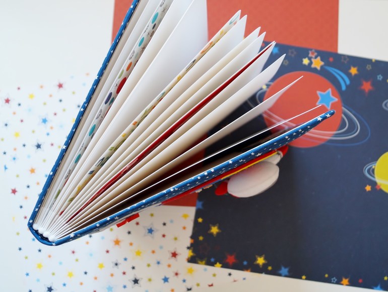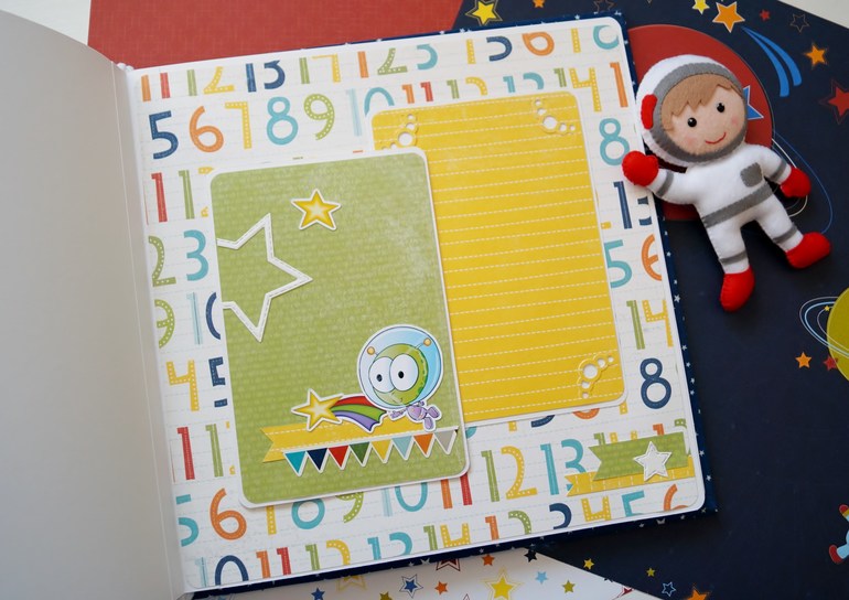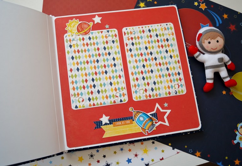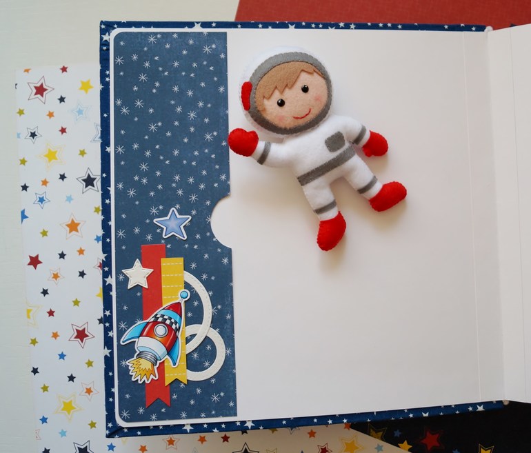 по этому альбому я подготовила МК, он очень подробный))) в нем я показываю, как сделать книжный переплет без сшивания, как сделать фетровый декор, съемного космонавта, создание подложки с использованием магнитов, и внутреннее оформление на примере одной из страничек.