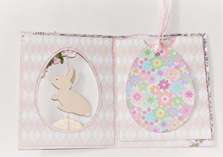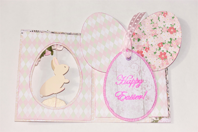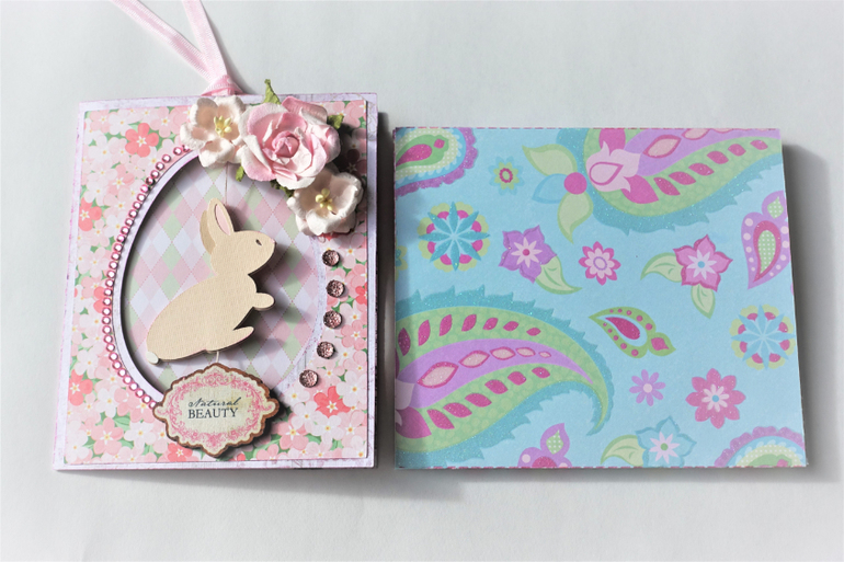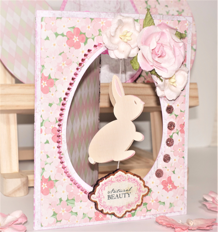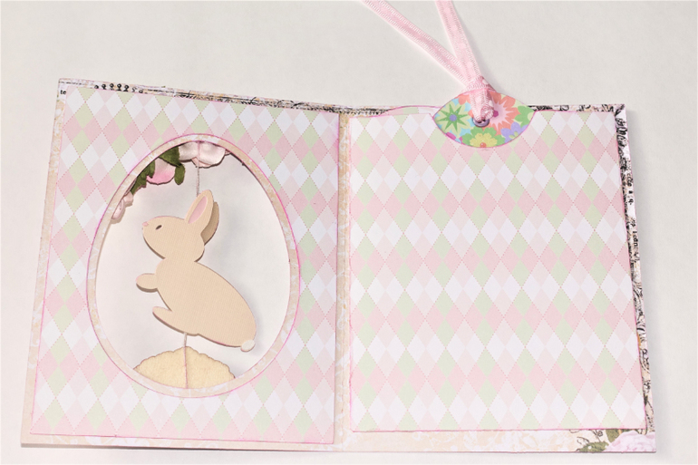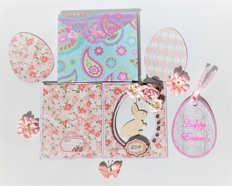 Видите, там зайчик тоже на конверте вырезан? Конверт, кстати сказать, в этот раз я решила сделать объемным. И то, надо было еще больше объема добавлять из-за цветов. Но все лучше, чем в плоском конверте. Так хоть можно любые украшения прикпеплять к открытке.