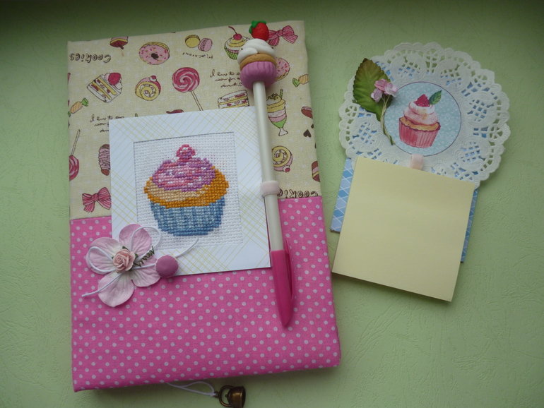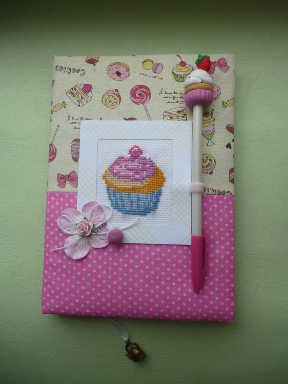 Кулинарная книга с распечатанными страницами, 5 разделителей, 200 страниц, сделана "с нуля". Мягкая тканевая обложка, коптский переплет, на обложке вышивка и ручка с кексом из полимерной глины, закладка с металлической подвеской, на заднем форзаце кармашек. И магнит на холодильник с блоком для записей.
