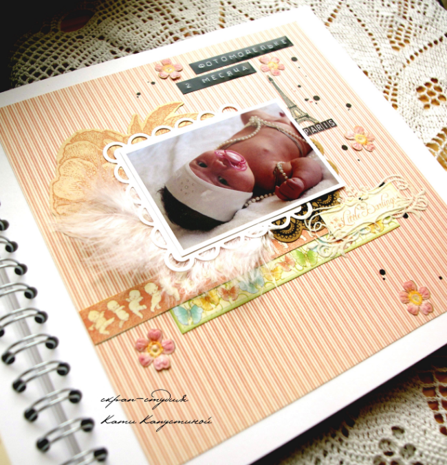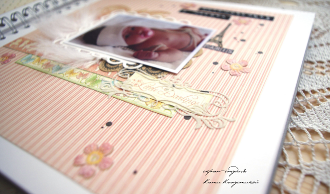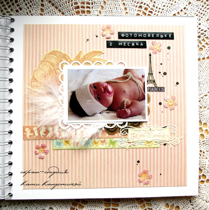 Эту фотографию мы сделали в Ялте, когда Даше исполнилось 2 месяца, во время нашего путешествия по Украине. Она у меня ассоциируется со словосочетанием "парижский шик", поэтому вопросов о предмете "парижского" задания у меня даже не возникало. Использована моя самая любимая коллекция Graphik45 (я когда нашла в продаже эту бумажку, купила сразу 3 набора, и захомячила их специально для дочиного альбома), вырубка, перышко Scrapberrys, флоковая натирка, вырубки Kaisercraft и Maya Road, распечатка надписи - на ленточном принтере Dymo.