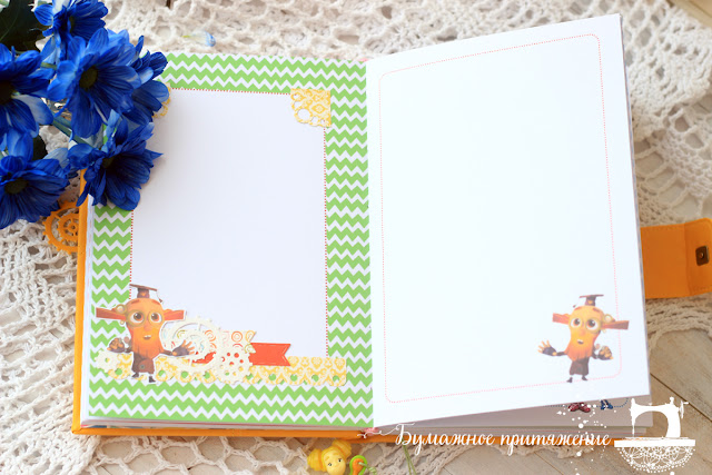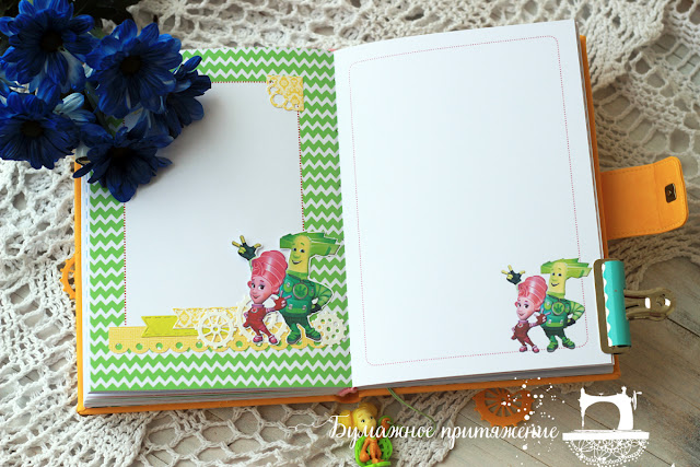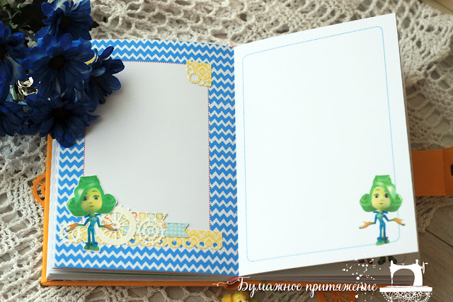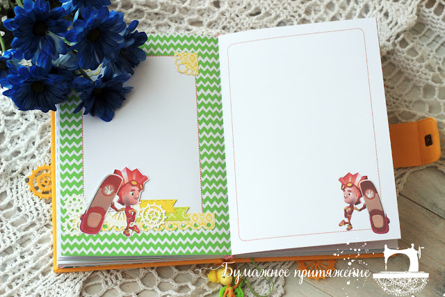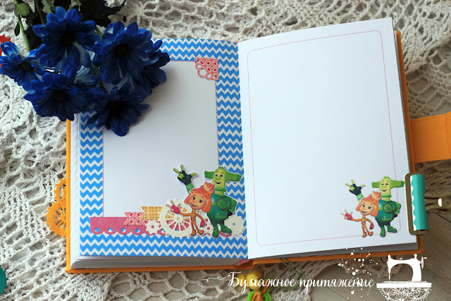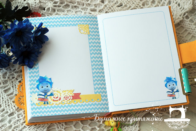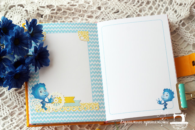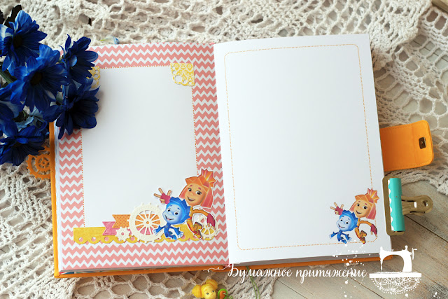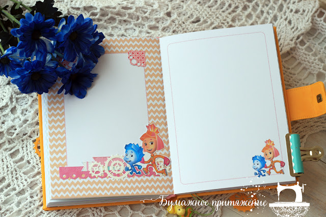 Внутри эти блокното-альбомчики практически одинаковые: 12 плотных разделителей с декорированными местечками для фото, по 12 страничек для записей после каждого, Фиксики на каждой страничке и кармашек на форзаце: