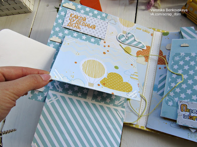 Альбом интерактивный в нем много интересностей и секретиков. Размер 20*20, 12 основных страниц (6 разворотов), есть места для бирочки,локона,огромное количество карточек для записей