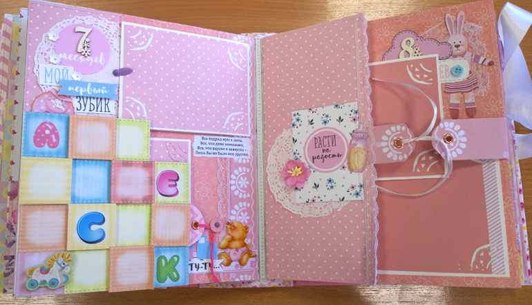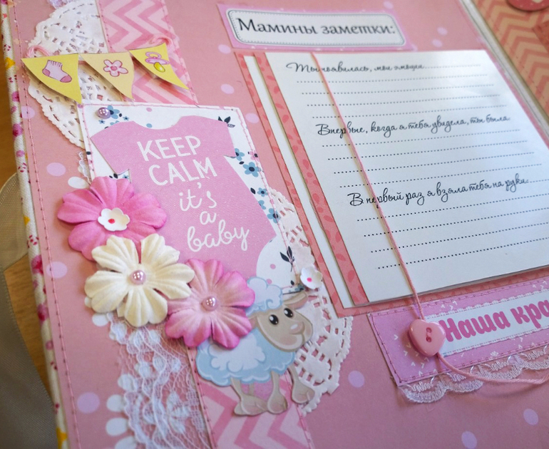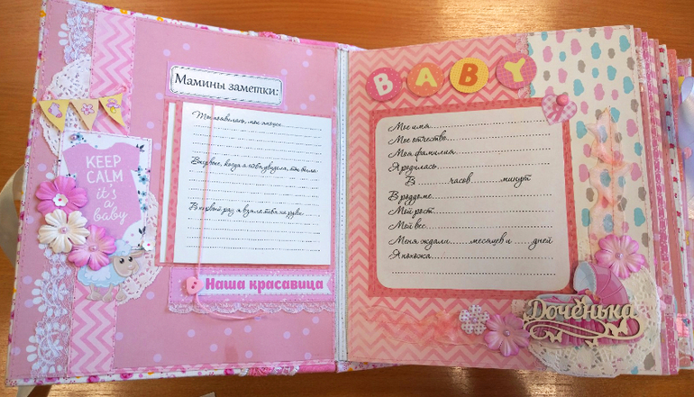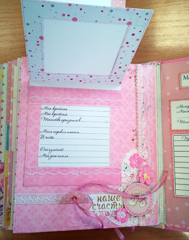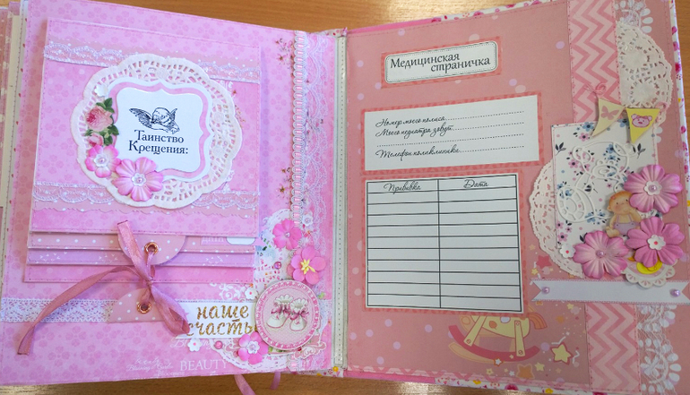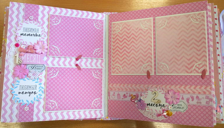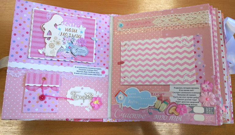 К рождению дочери решила сделать фотоальбом в технике скрапбукинг. Давно мечтала освоить эту технику, и, наконец-то представился повод. Очень хотелось сделать именно такой, розовый-розовый альбом)