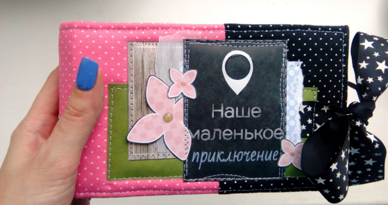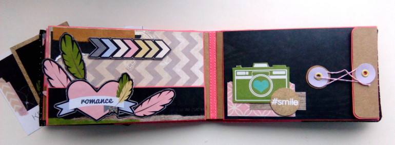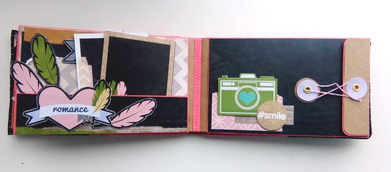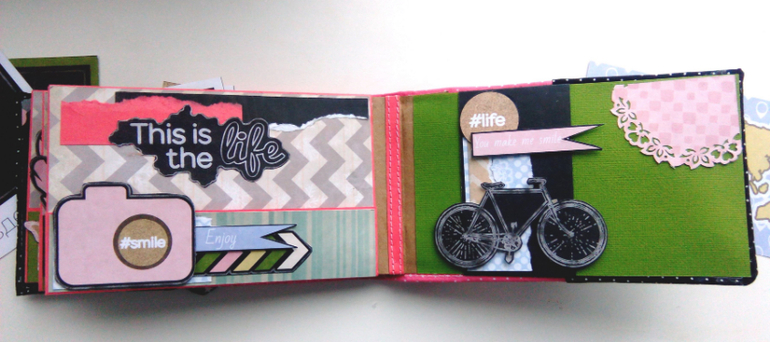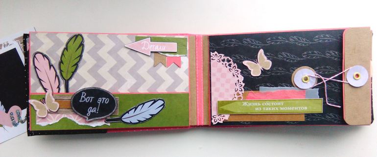 Всего четыре разворота, справа конверт для фото, слева карман для тегов, карточек, записок.