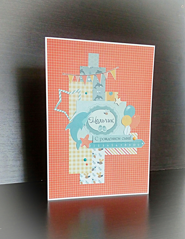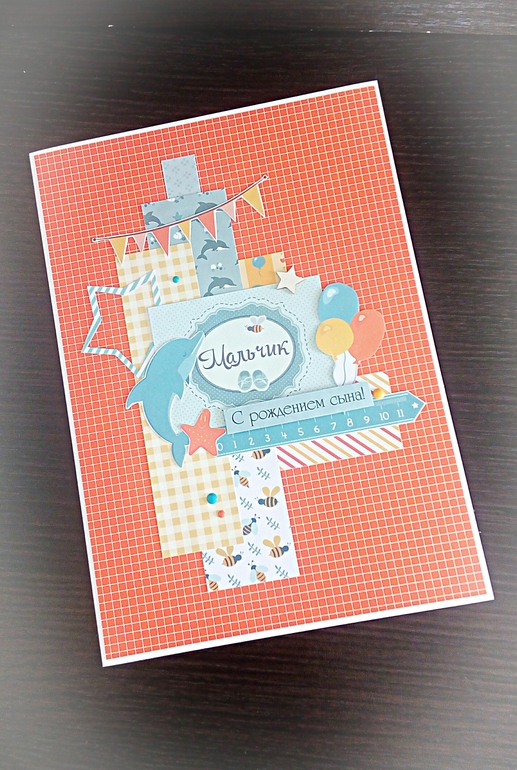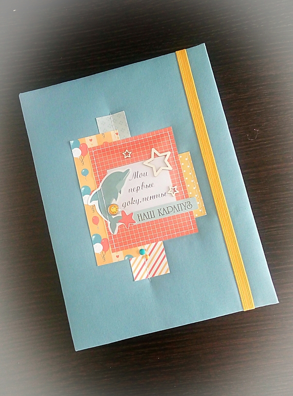 Комплект выполнен из яркой, малышковой коллекции Наши детки. Мальчики от Бумажный уголок. В работе также использовала вырезалки из этой коллекции, карточки, чипборд, брадсы, дотсы.