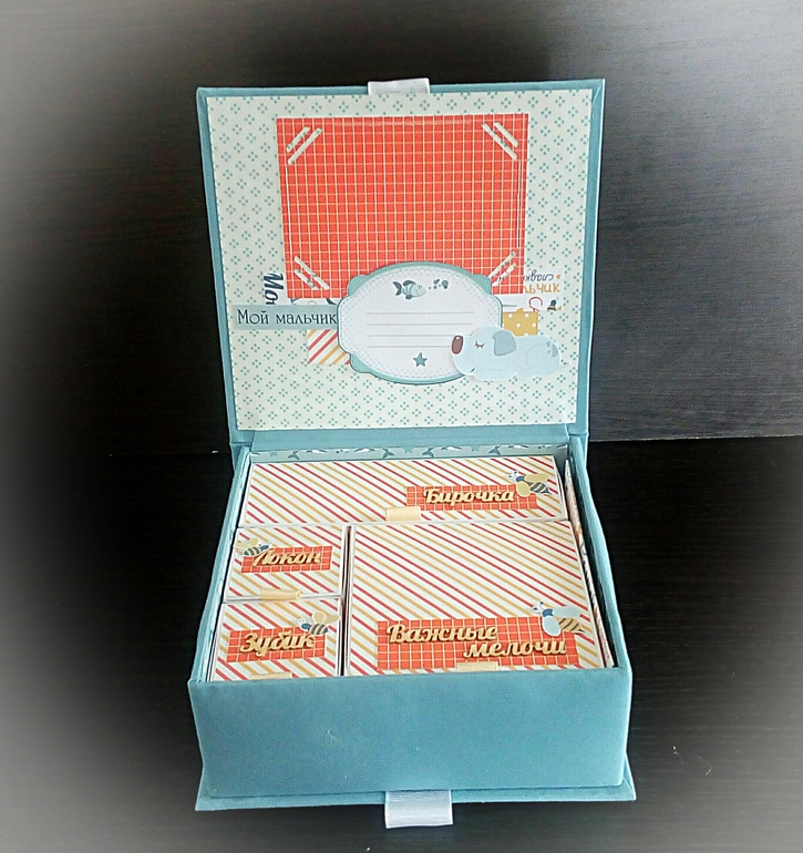 Внутри 4 коробочки: бирочка, локон, зубик, важные мелочи. Также есть место для фото, конвертик для мелочей и карточки развития малыша: