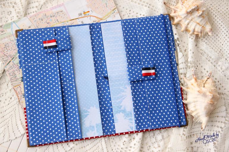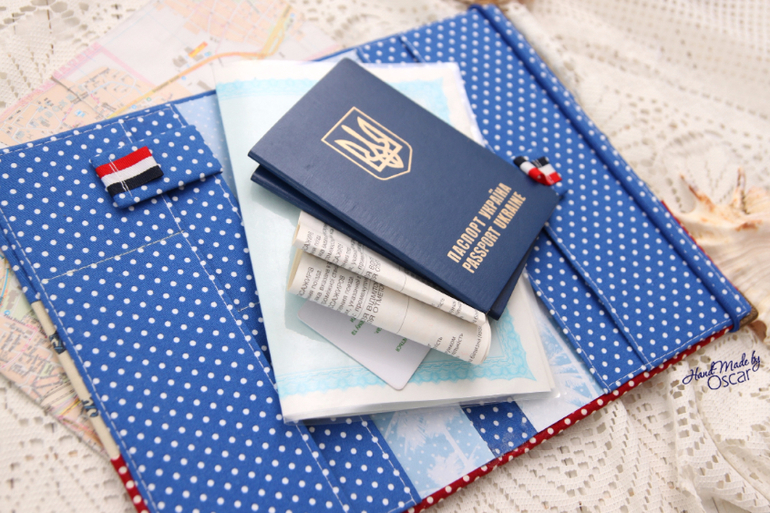 Сделала нам холдер для документов, довольно вместительный, "семейный" размерчик. Ведь нужно вместить 2 обычных бумажных паспорта, мой и мужа, паспорт-карточку старшего сына, для него нужен карман с застежкой, все время боюсь его потерять))) и немаленькое свидетельство о рождении младшего сына, да еще и билеты, туда и обратно - это уже стопочка из 8 штук.