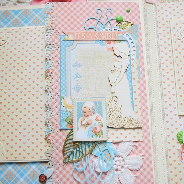 Первый разворот предполагает фото беременной мамочки, есть конверт для бирочки или снимка УЗИ.