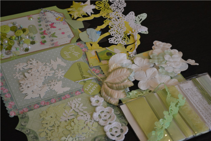 А вот и содержимое(3 листика бумаги, ленточки, бумажные листики и цветочки, тычинки, дырокольности, наклейки, вязаные цветочки, рамочки, пуговки, стразики и брадс):
