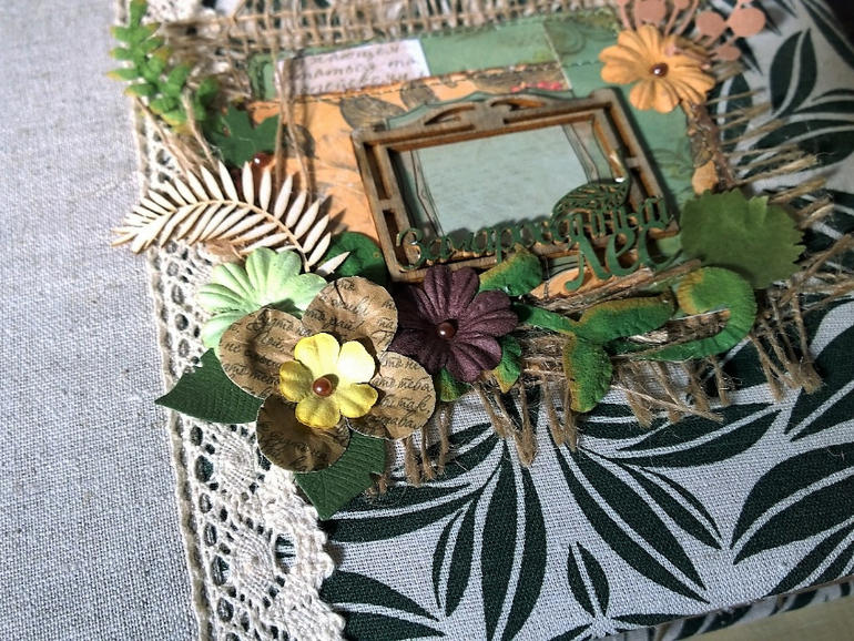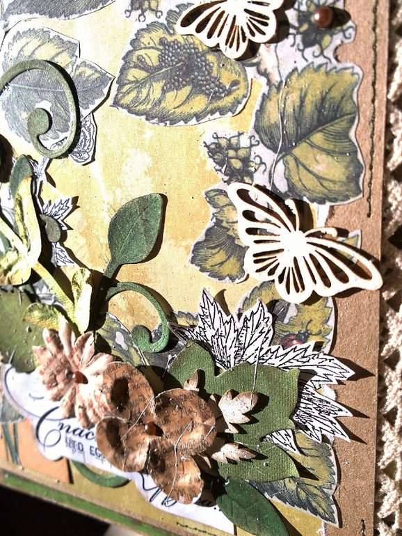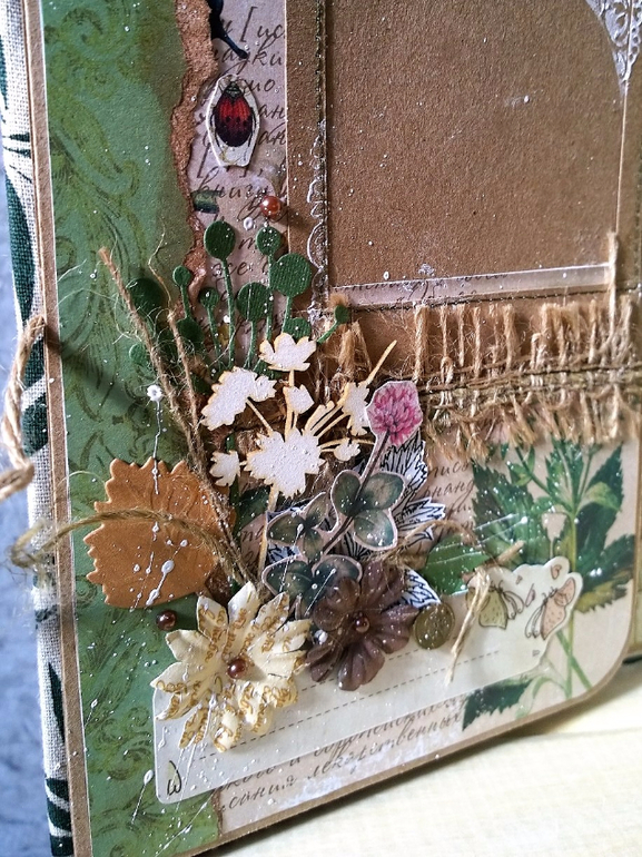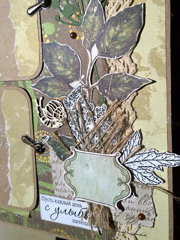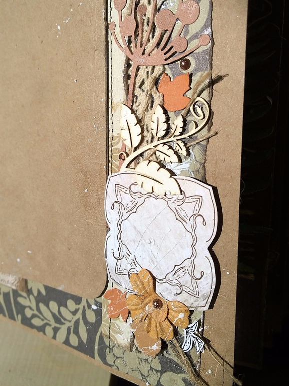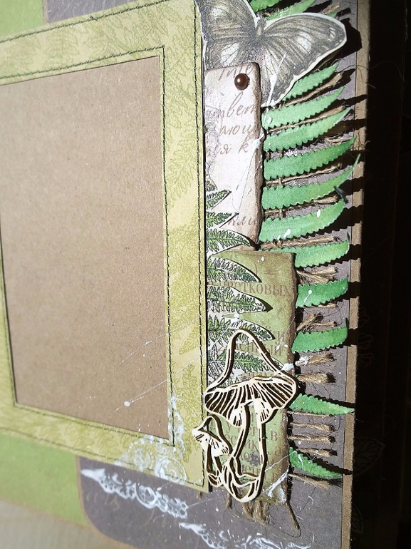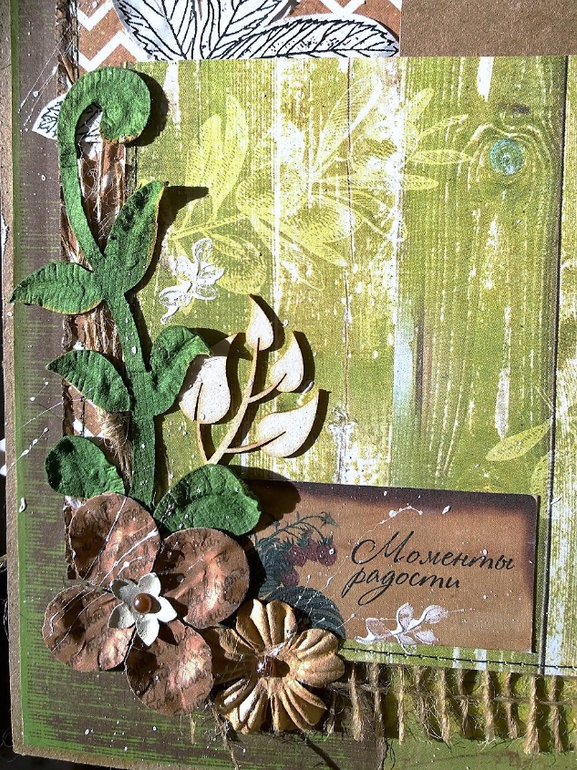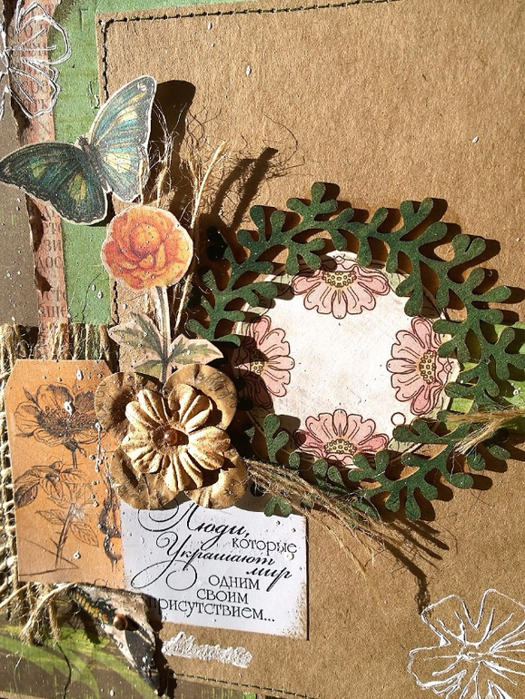 В работе использовала много высечек, черно-белые рисунки трав; чипборды, крафт-бумагу и штампы.