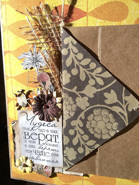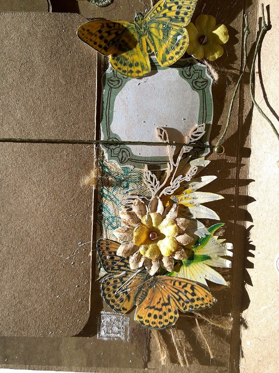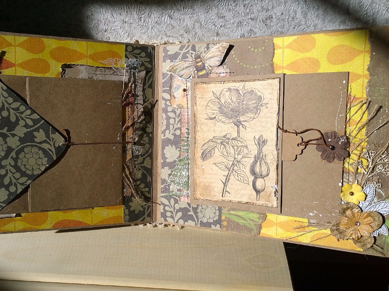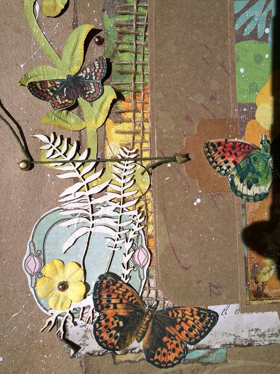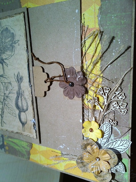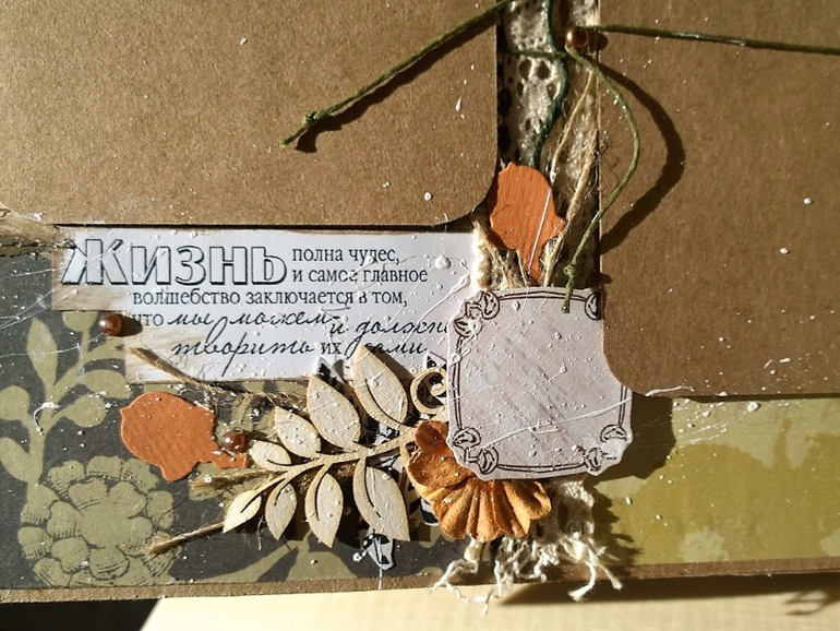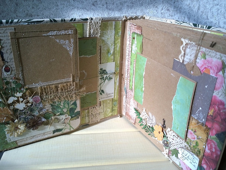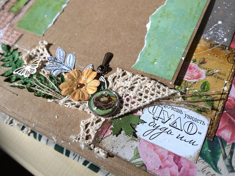 В работе использовала много высечек, черно-белые рисунки трав; чипборды, крафт-бумагу и штампы.